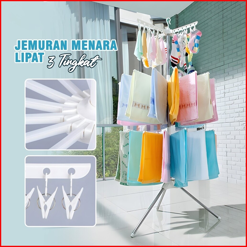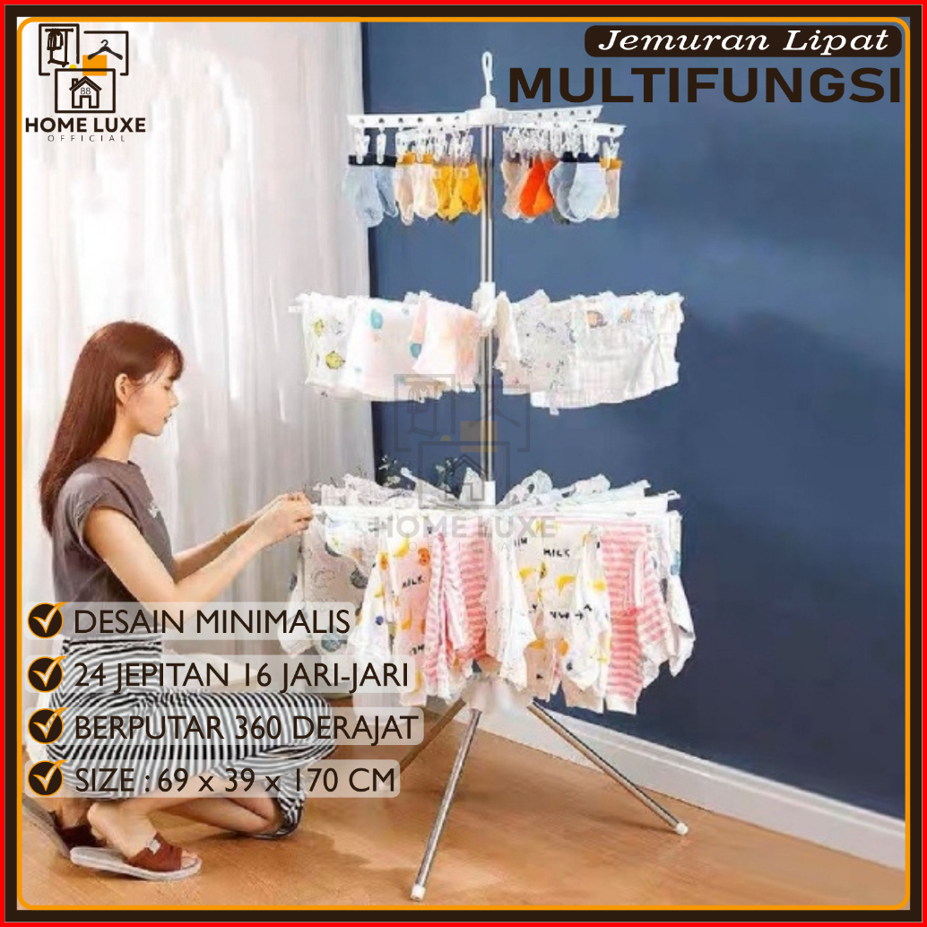 Homeluxe Jemuran Baju 3 Susun 24 Jepitan Baju 16 Jari-jari Gantungan Baju Jemuran Lipat