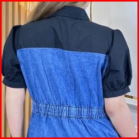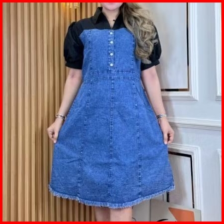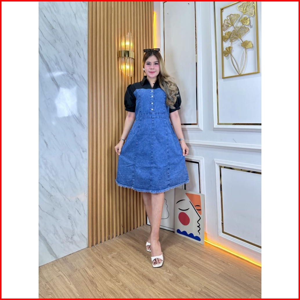 Dress Jeans Wanita V Neck Pinggang Karet 3 Ukuran