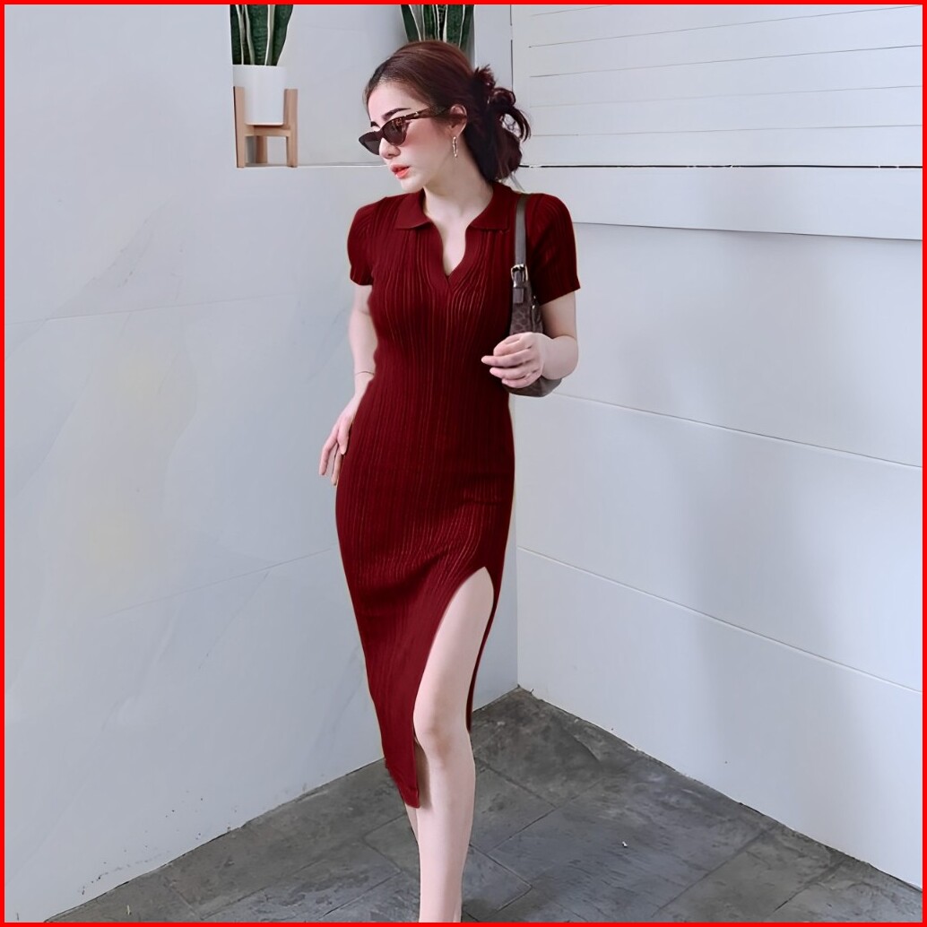 Miss Shop S - Dress Rajut Bodycon Lengan Pendek V-neck Belahan Samping 4401