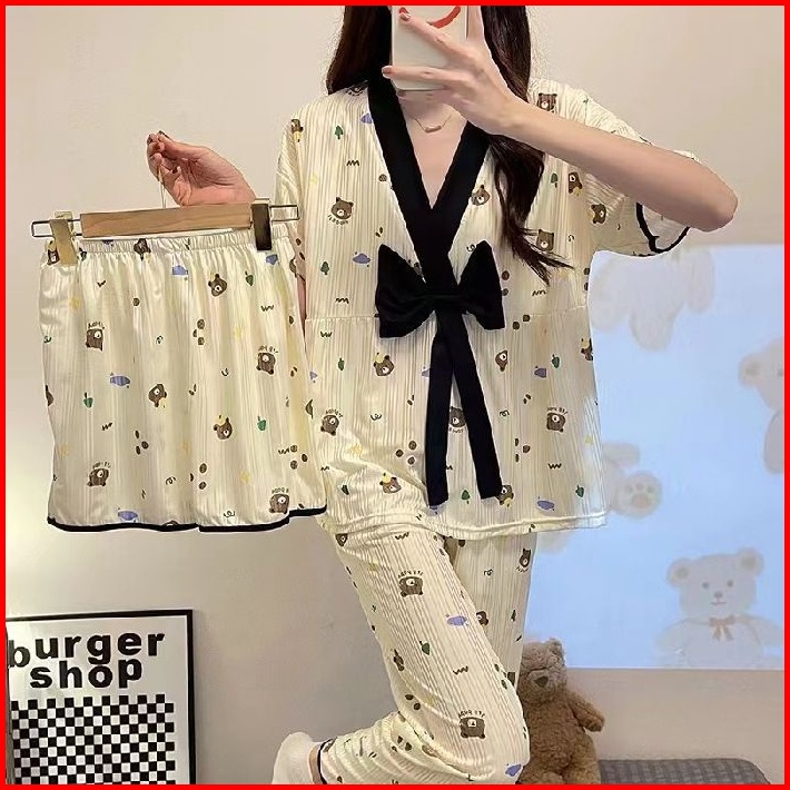 Ss Piyama 3in1 Import Wanita Baju Rumah 1 Set Lengan Pendek Celana Pendek Panjang