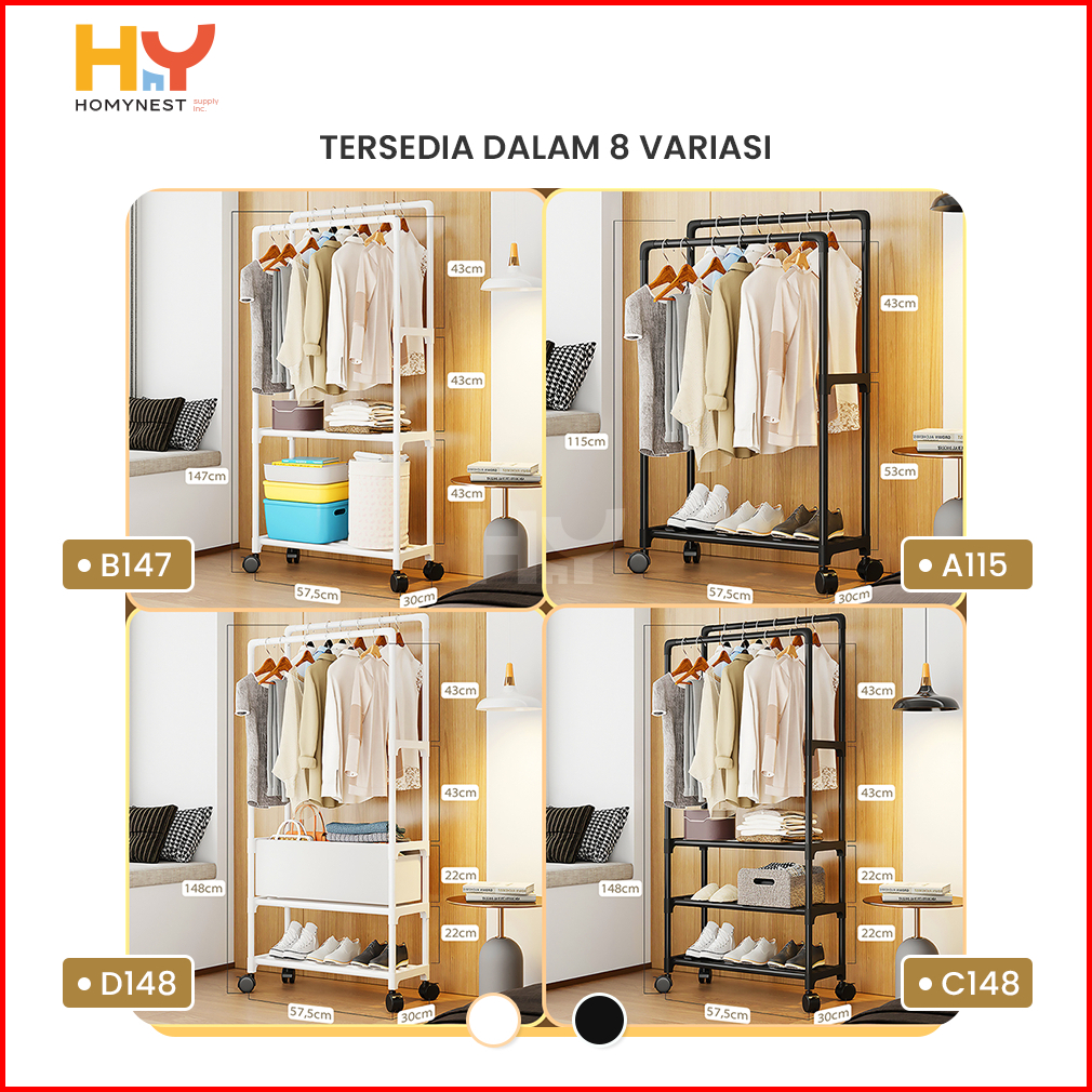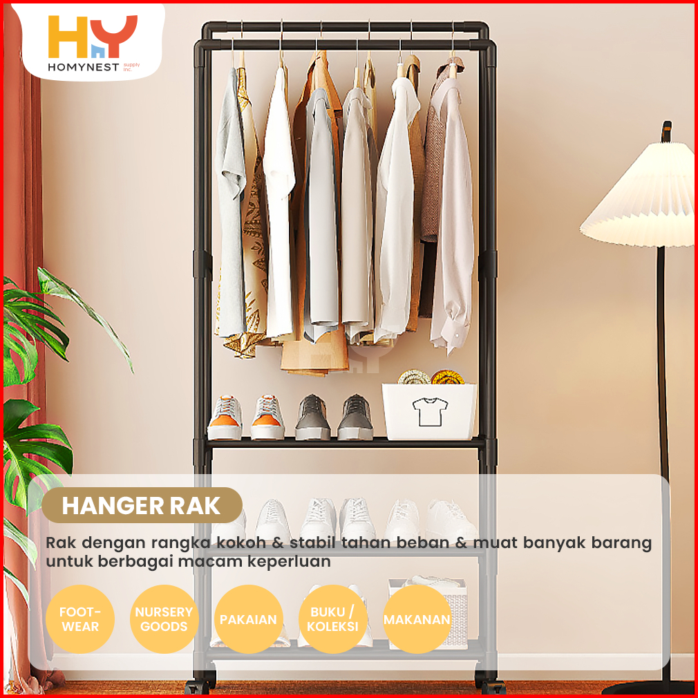 Homynest Stand Hanger Rak Gawang Baju Serbaguna Dengan Roda Minimalis Portable 2 Tingkat Berkualitas