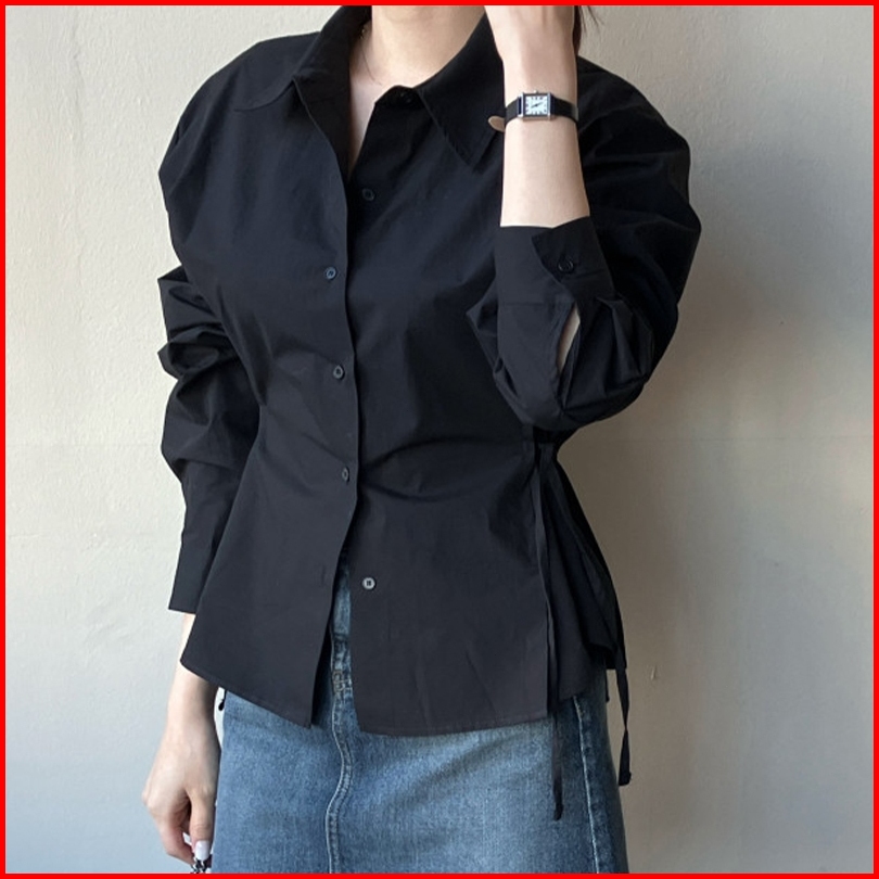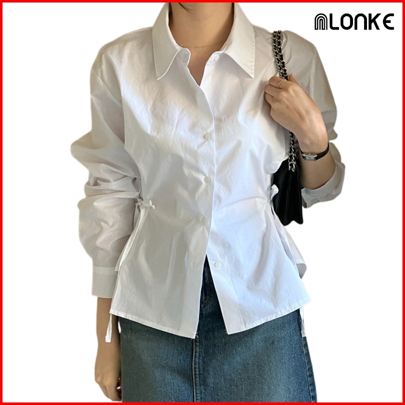 Nlonke - Kemeja Lengan Panjang Kancing Pas Ramping Kemeja Bertali Retraksi Pinggang Kemeja Temperamen Wanita