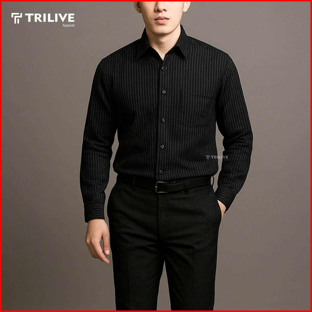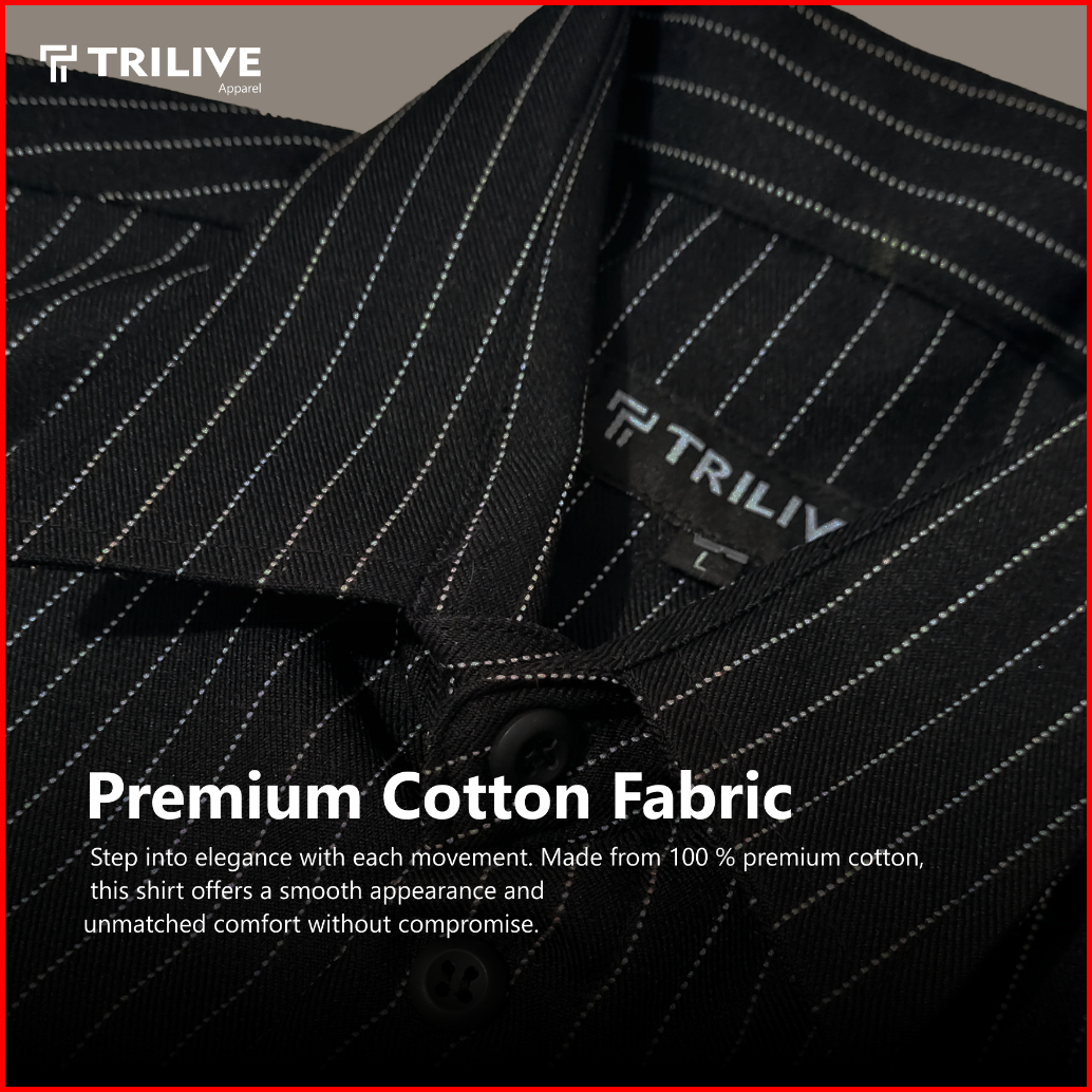 Trilive - Kemeja Pria Stripe Lengan Panjang Slim Fit Salur Hitam