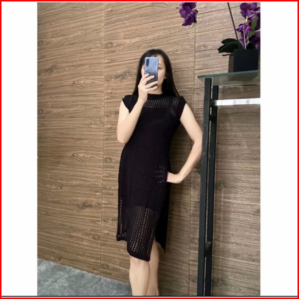Ruby Tunik Dress Atasan Wanita Rajut Jaring Belah Samping Pinggir Baju Panjang Casual Mini Hitam