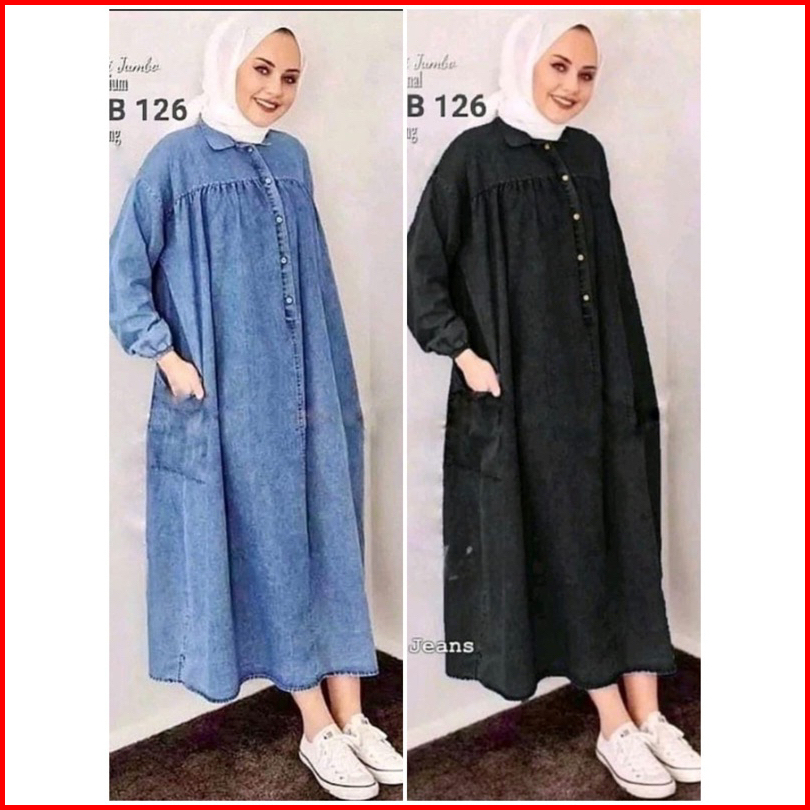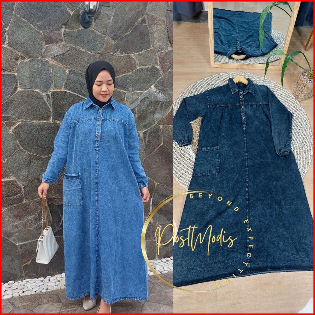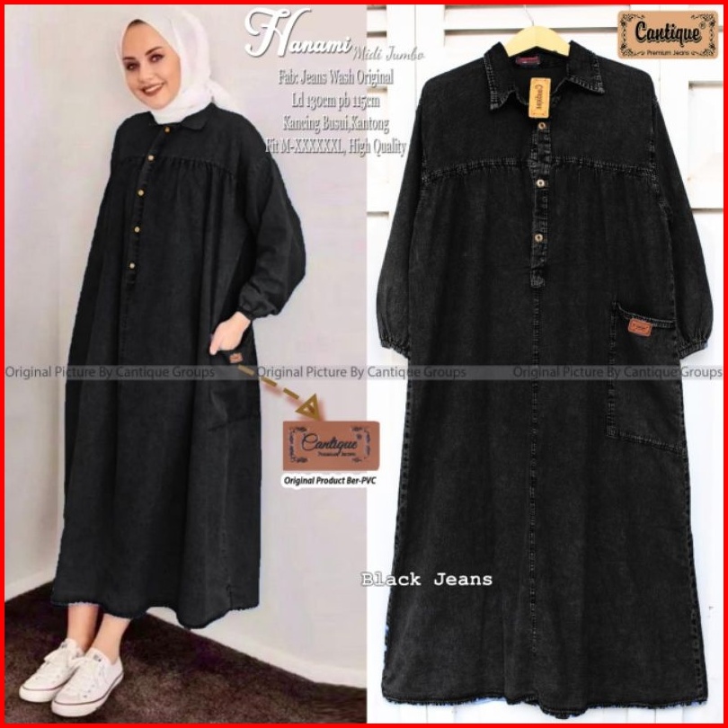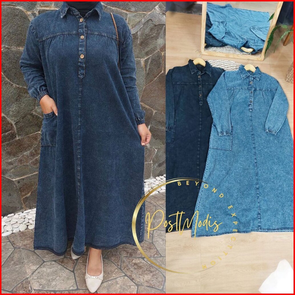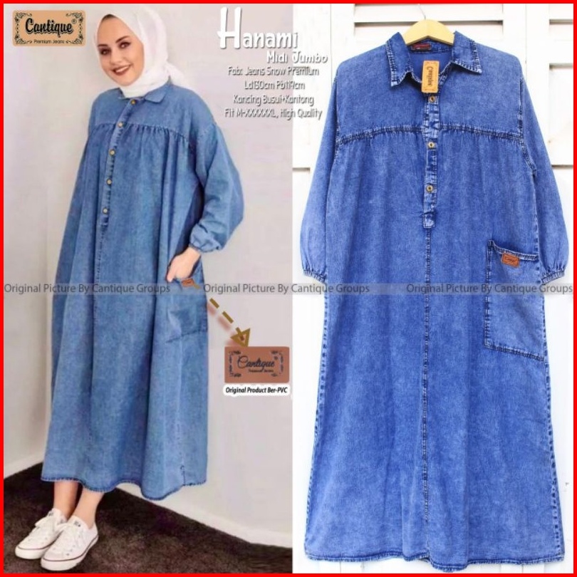 Mahalini Hanami Midi Dress Jeans Wanita Cantik Kekinian Terbaru Snow Blue Denim Dan Hitam Bajuratu