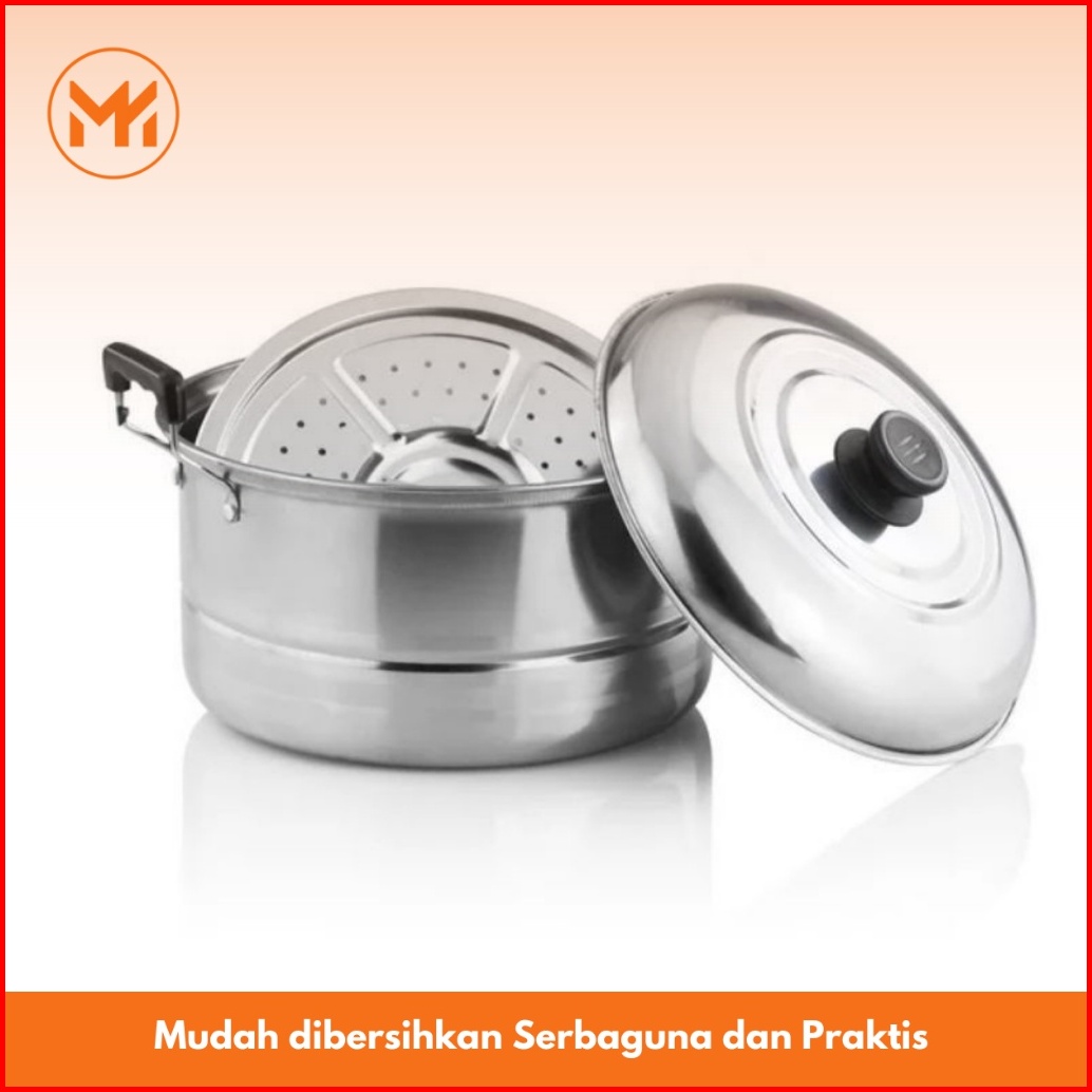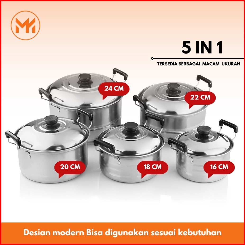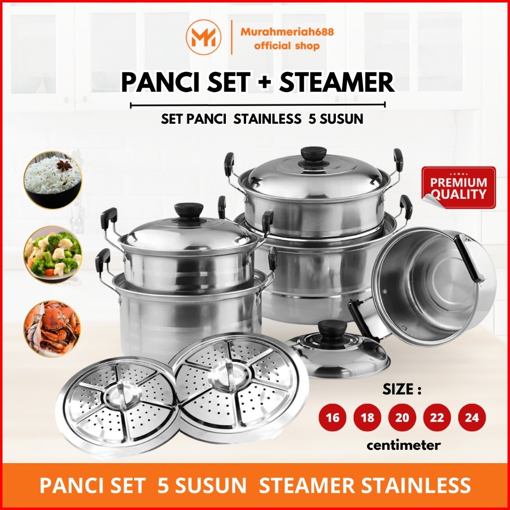 Panci Set 5 Susun Steamer Stainless - Panci 16-24 Cm Original - Panci Sop Soup Dengan Kukusan Tatakan Dandang - Panci St