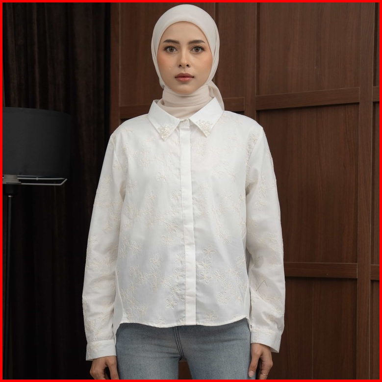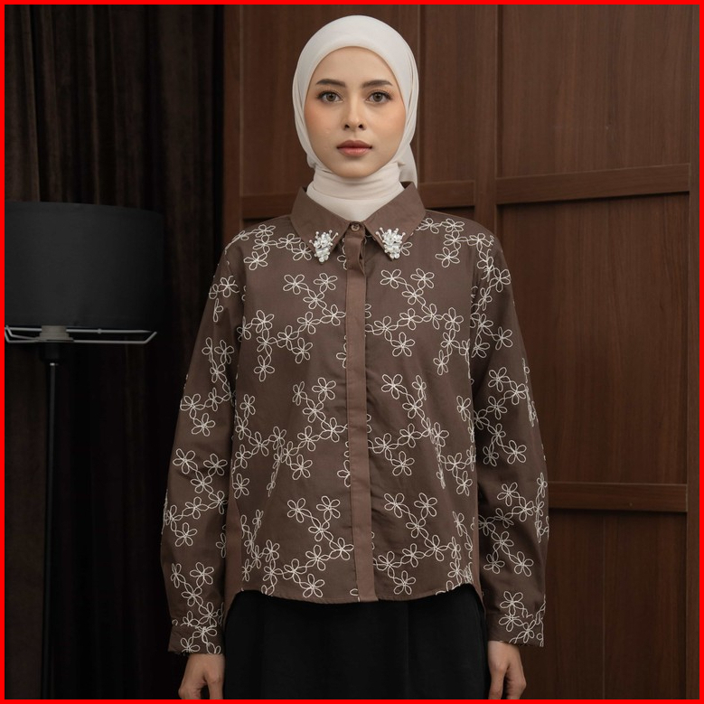 Mayoutfit Luxias Shirt Kemeja Wanita Coklat Mahogany Maroon Kombinasi Motif Bordir Floral Embroidery Aksen Payet