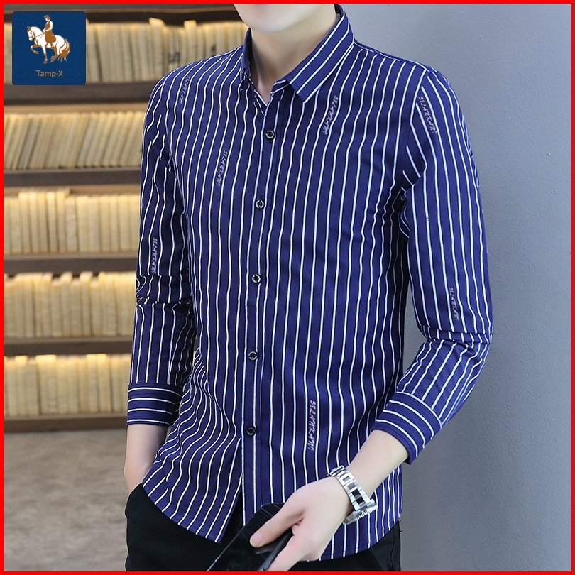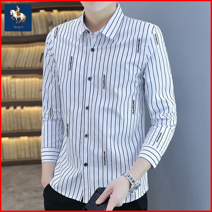 Tamp-x Kemeja Pria Distro Bordir Garis-garis Lengan Panjang Putih Hitam Premium