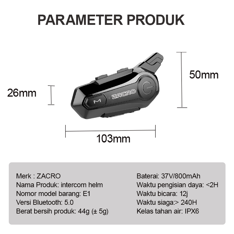 E1 Intercom Helm Bluetooth 5.0 /Headset Bluetooth Helm/Waktu Siaga Yang Lama/Peringkat Tahan Air Ipx6/Perlengkapan Motor