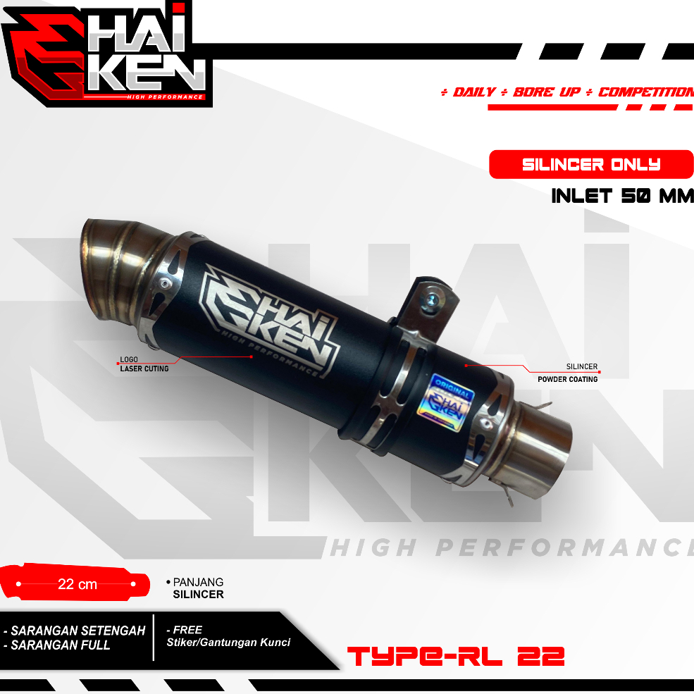 silincer selencer original HAIKEN type RL 22 inlet 50 black coating sarangan full sarangan setengah