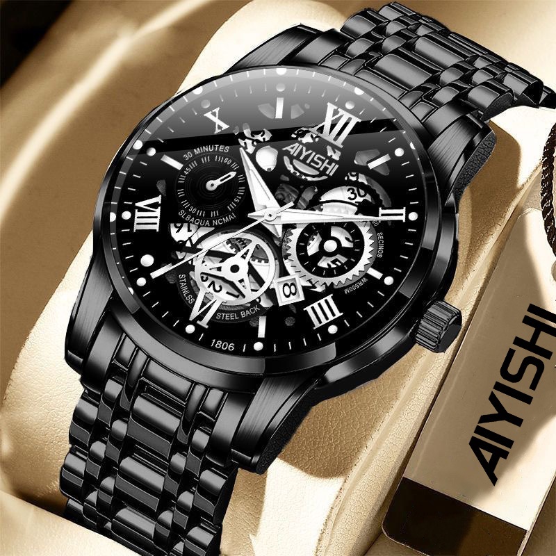 AIYISHI Jam Tangan Pria Original Display Kuarsa Cahaya malam Anti Air Tali Stainless Steel
