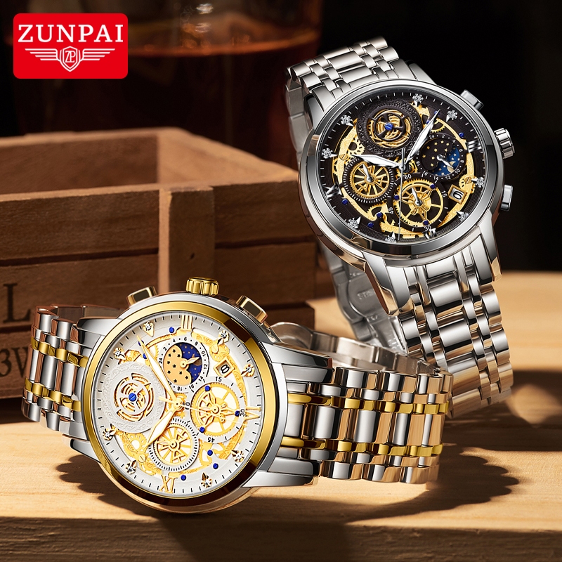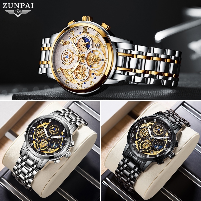 ZUNPAI Jam Tangan Pria Asli Anti Air Baja Tahan Karat Bisnis Bercahaya Kronograf Fashion Multifungsi Jam Pria Kotak Hadiah Set Watch Men