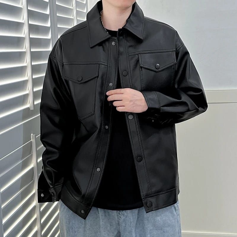 Jacket Kulit pria wanita mantel kerah lipat jaket kulit keren casual clasic style