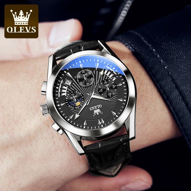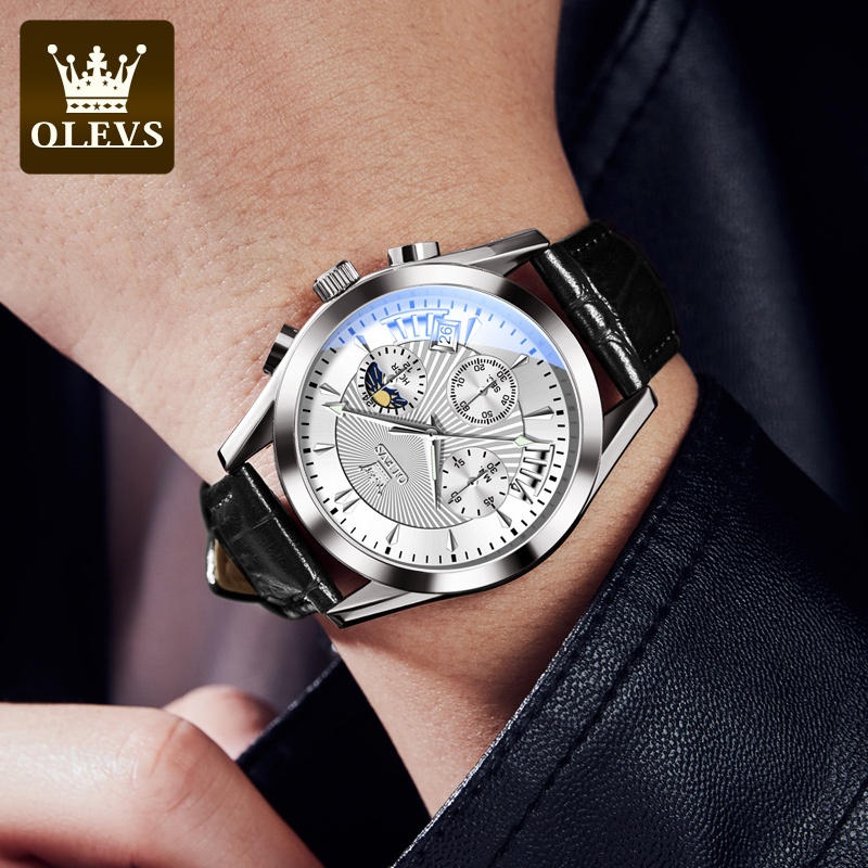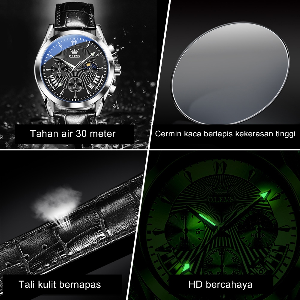 OLEVS Jam Tangan Pria Anti Air Original Terbaru 2025 Busana Kulit Multifungsi Luxury Chronograph Luminous Kalender Analog