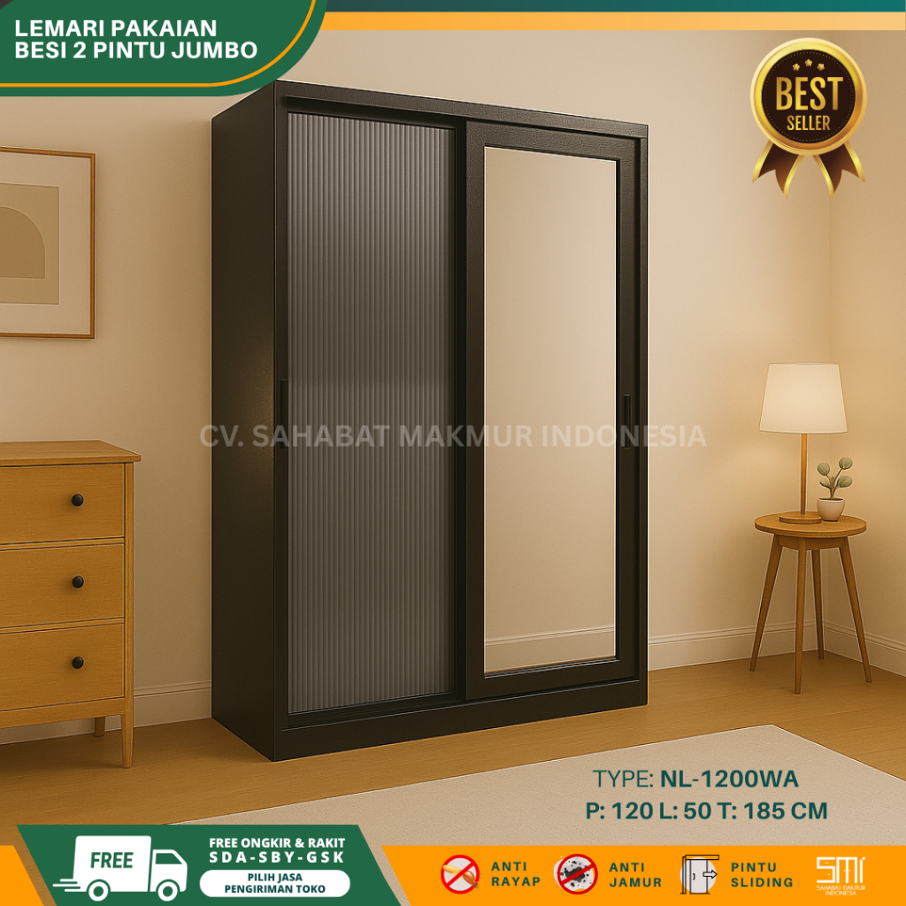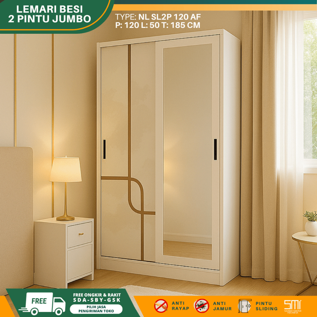 Lemari Besi 2 Pintu Premium Jumbo - Lemari pakaian, lemari besi 120cm, Lemari Sliding,Metal Wardrobe Gratis Ongkir