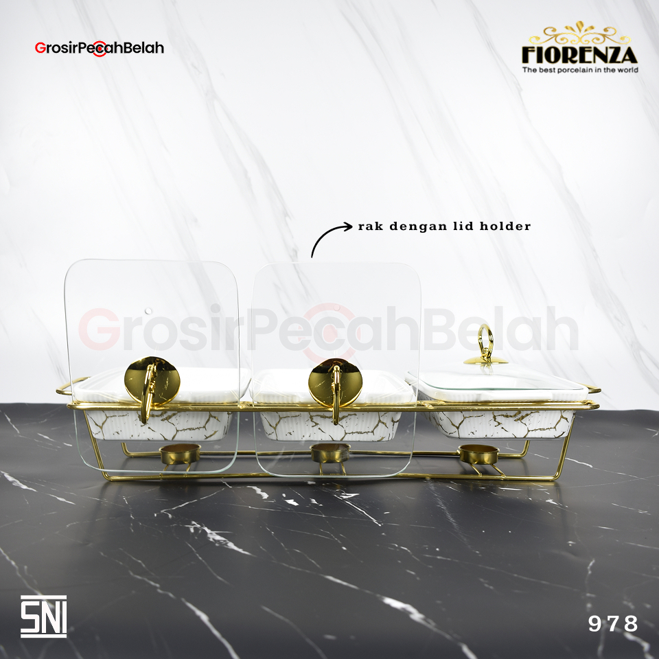 Prasmanan Wadah Saji Penghangat Makanan Keramik Set Casserole | Tempat Basi Elegan Motif Marbel Lining Gold, Tahan Panas & Estetik 978