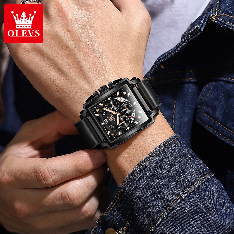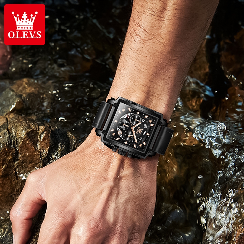 OLEVS Jam Tangan Pria Anti Air Original 100 PERSEN Resmi Tali Kulit Mewah Import Terbaru Cowok Tahan Chronograph Keren Led Hitam