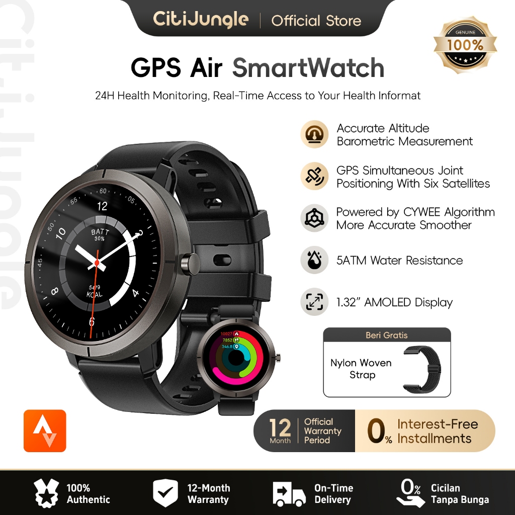 Citijungle GPS AIR Smartwatch GPS Frekuensi Ganda Multi Sistem Support Strava | Layar AMOLED 1,32” HD | Pemantauan Kesehatan Lengkap