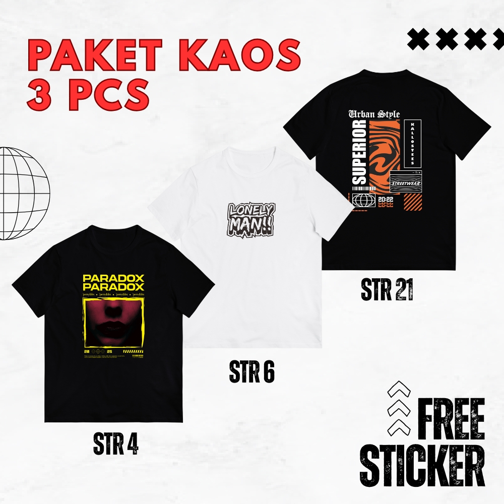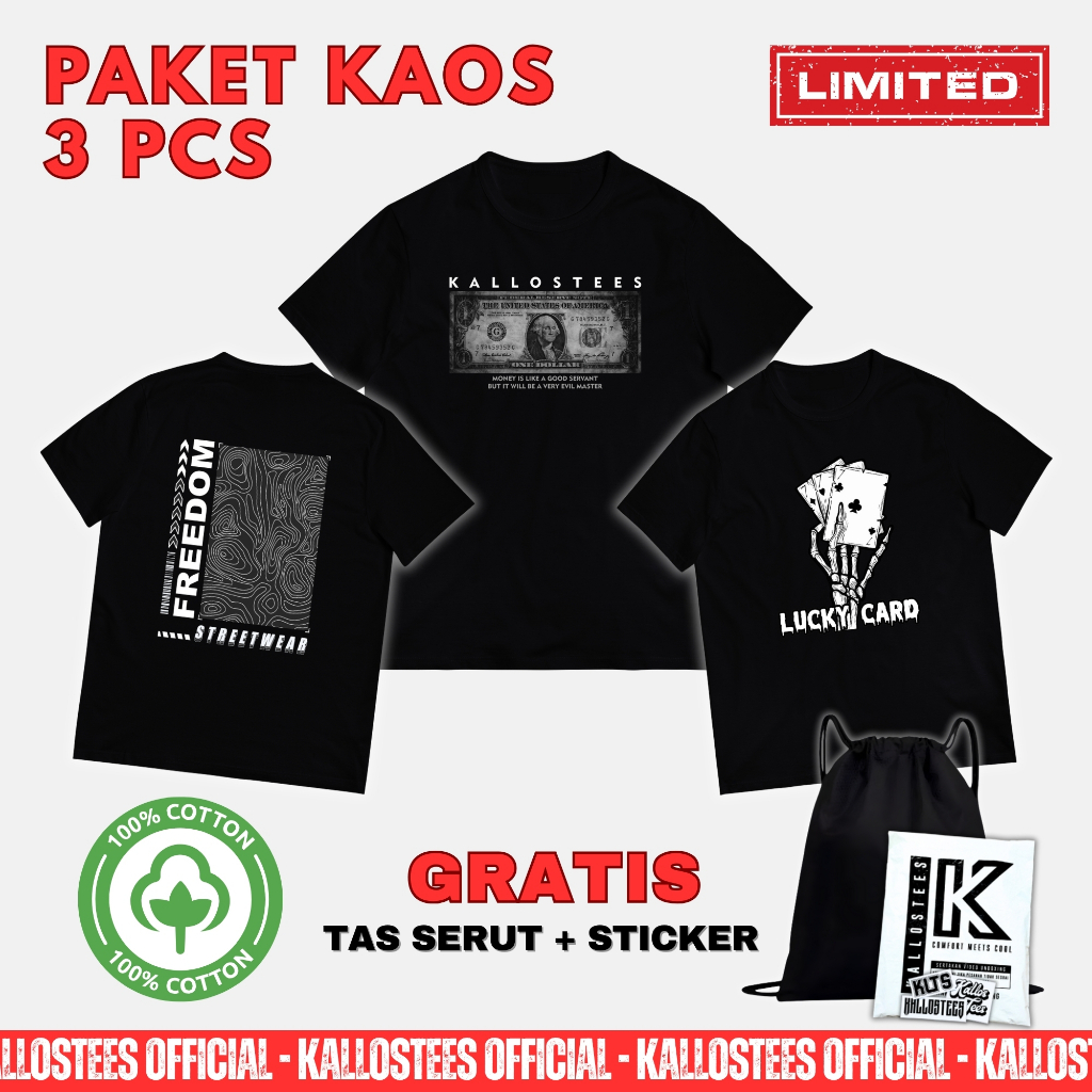 PAKET HEMAT 3 Kaos Distro Pria Unisex | 100% Cotton Combed 24s Hitam Putih | GRATIS Tas Serut – KALLOSTEES