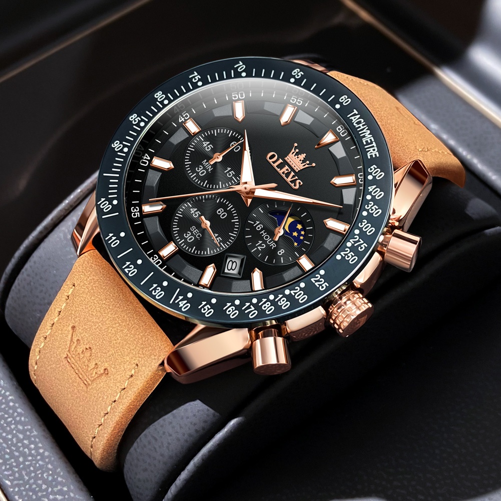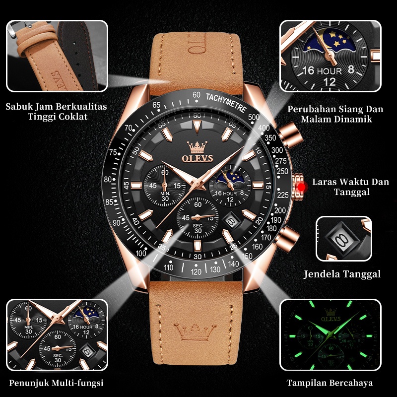 OLEVS Jam Tangan Pria Original Anti Air Kulit Tahan Keren Led Hitam Luxury Chronograph Watch Men Multifungsi Model 9957
