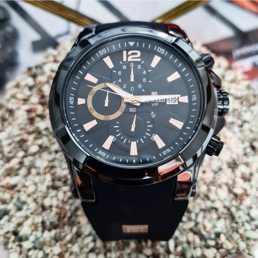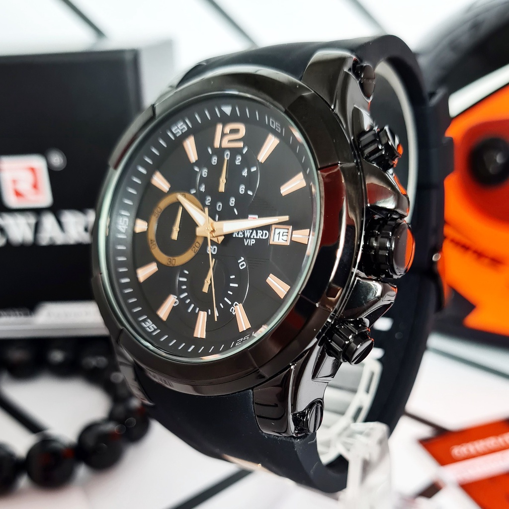Jam Tangan Pria Original REWARD Bayonet Black Hitam Rubber Karet SIlikon Analog Chrono Aktif