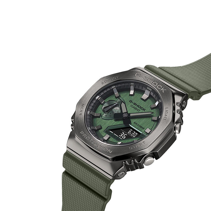 Jam Tangan Pria Casio G-Shock GM-2100B-3ADR CasiOak Metal Covered Green Analog Digital Dial Green Olive Resin Band