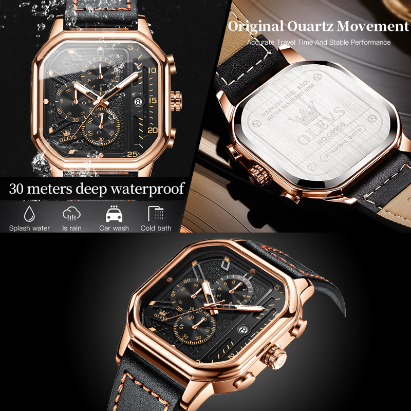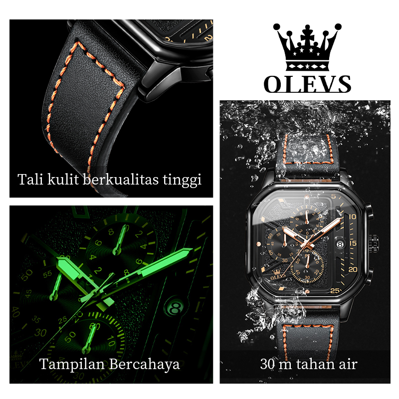 OLEVS Jam Tangan Pria Original Anti Air Kulit Tahan Keren Led Hitam Coklat Luxury Chronograph Watch Men Multifungsi
