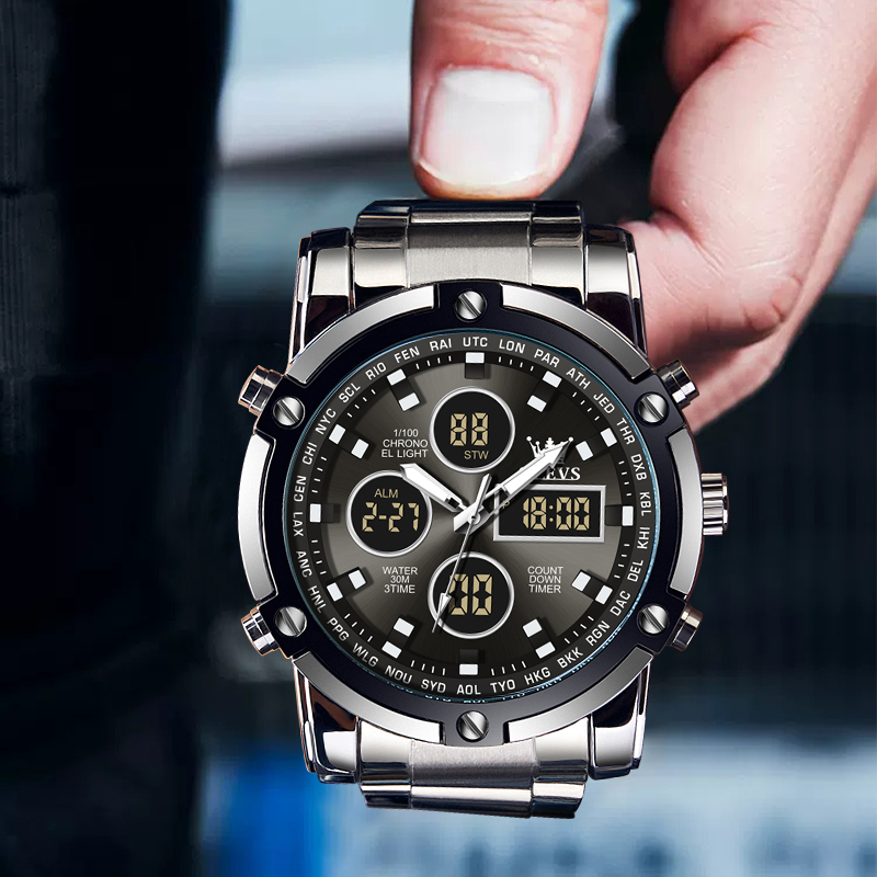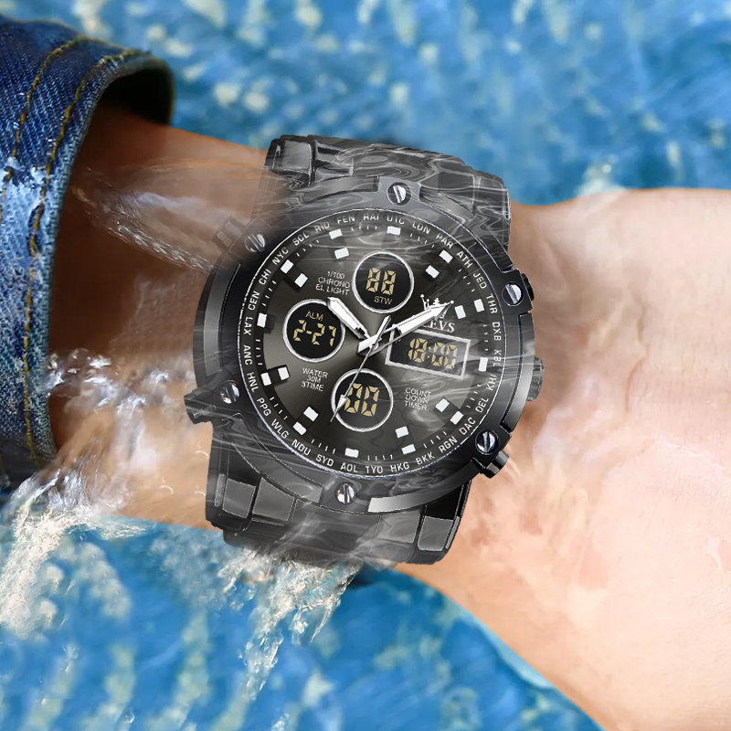 OLEVS Jam Tangan Pria Anti Air Original Digital Multifungsi Kronograf LED Alarm Tahan Air 30 Meter Hitam Men Watch