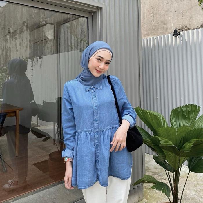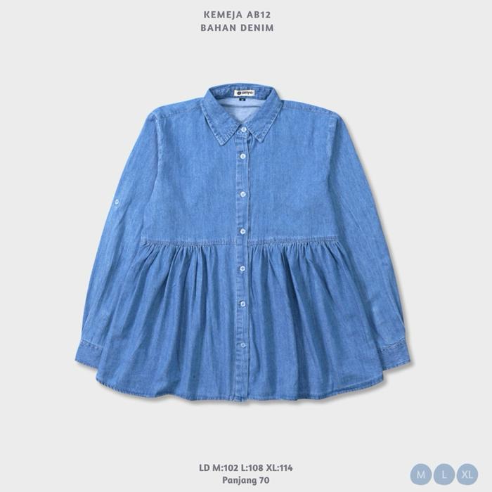 Anyostore Ab12 Atasan Kemeja Jeans Polos Wanita Bahan Denim - Ab12 Denim On Model, M