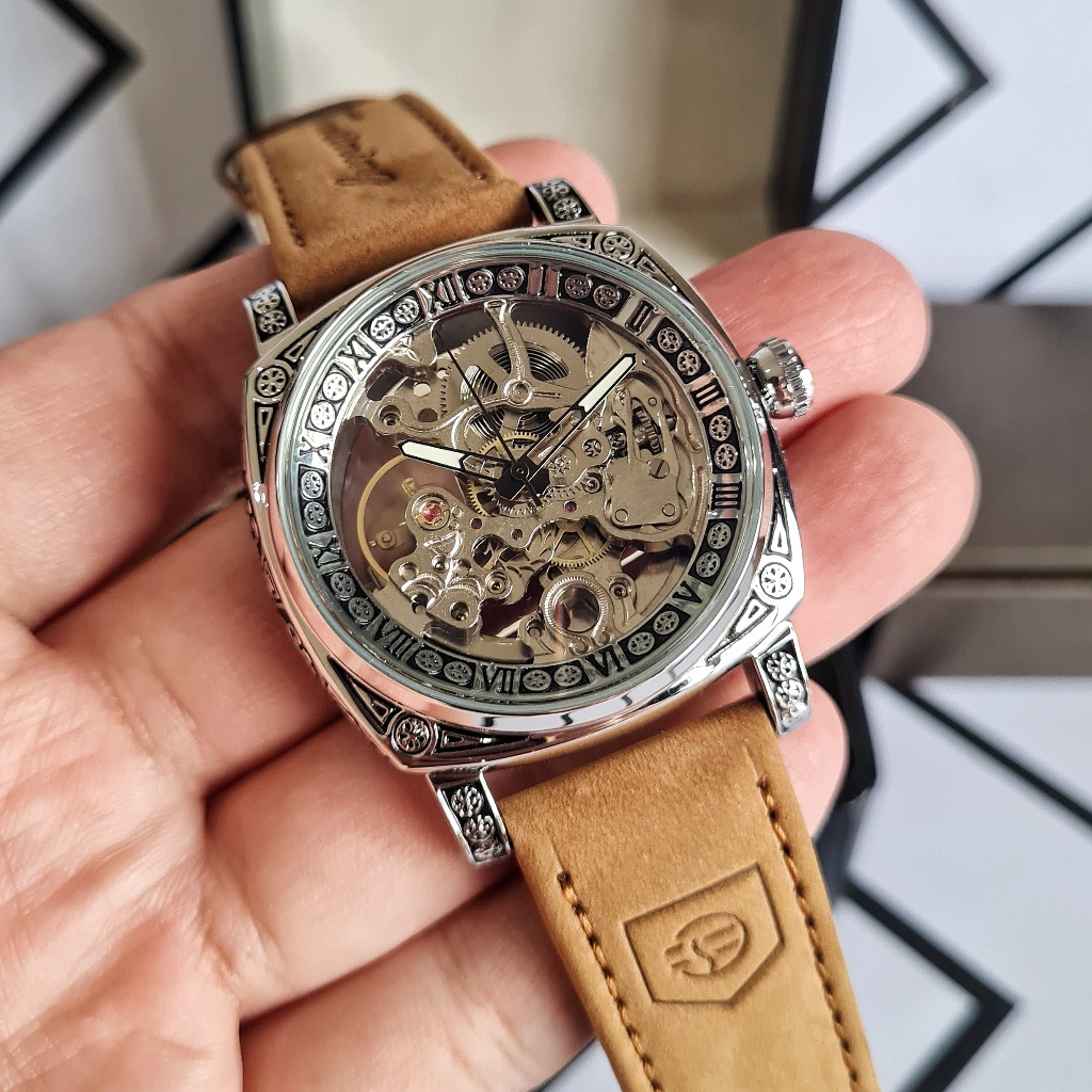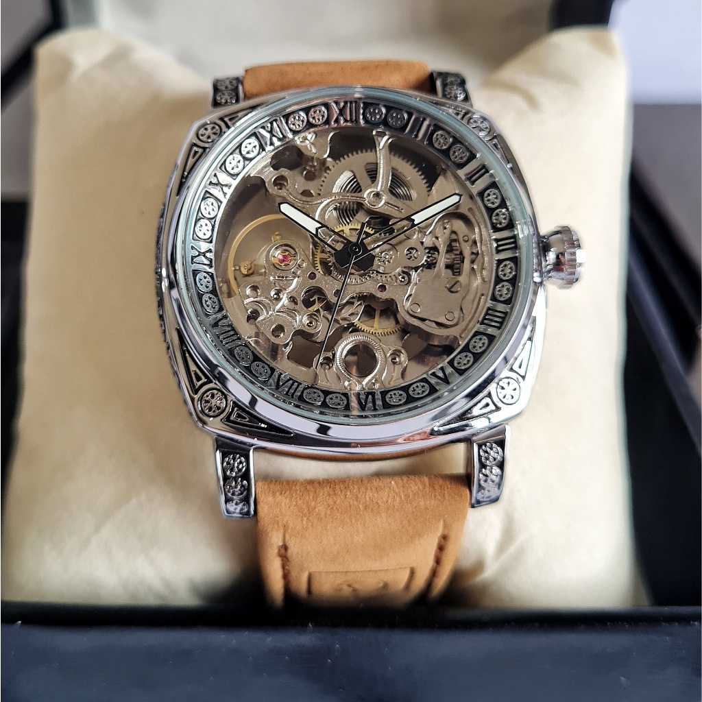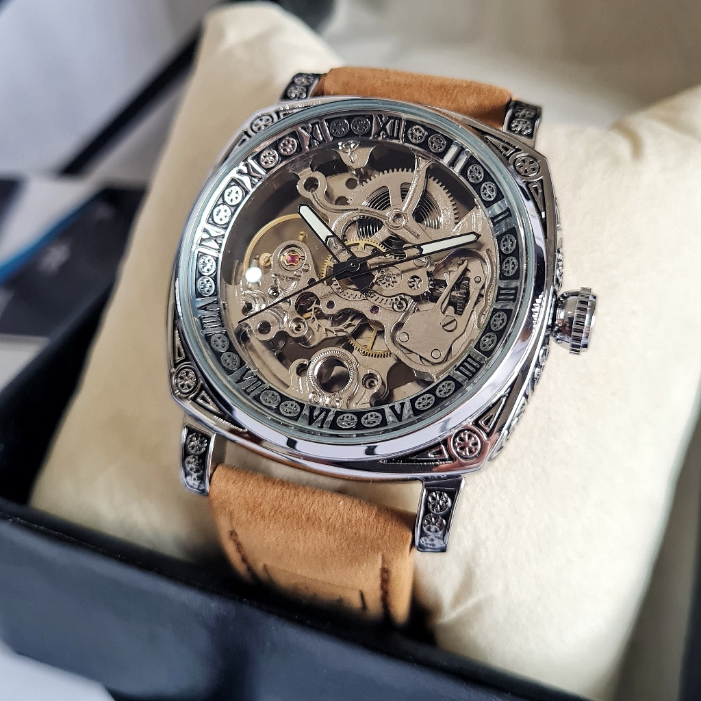 Jam Tangan Pria Original FORSINING Tyrant Automatic Otomatis Mechanical Mekanik Skeleton Tali Coklat Brown Leather Strap Silver