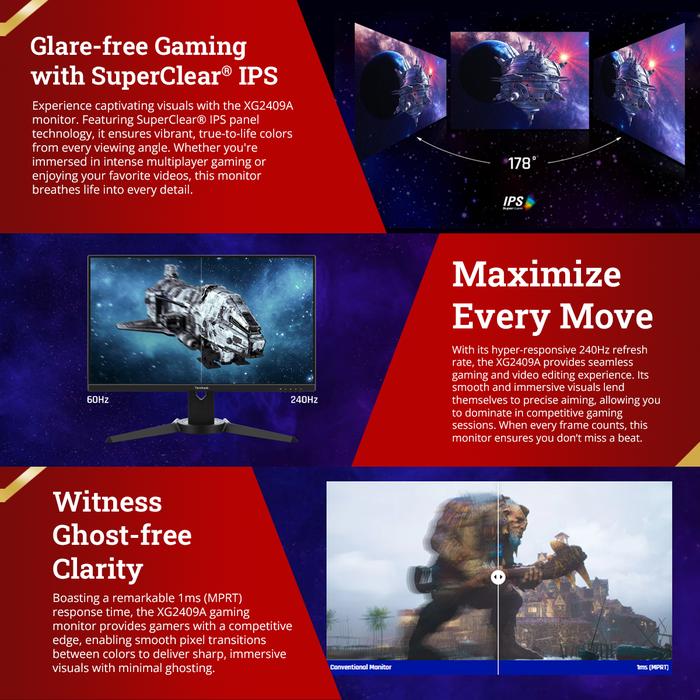 MONITOR VIEWSONIC XG2409A / 24 INCH / 1920X1080 / HDMI 1.4X2, DP / NO SPEAKER / IPS / 100X100/ 240HZ / AMD FREESYNC /ERGONOMICS