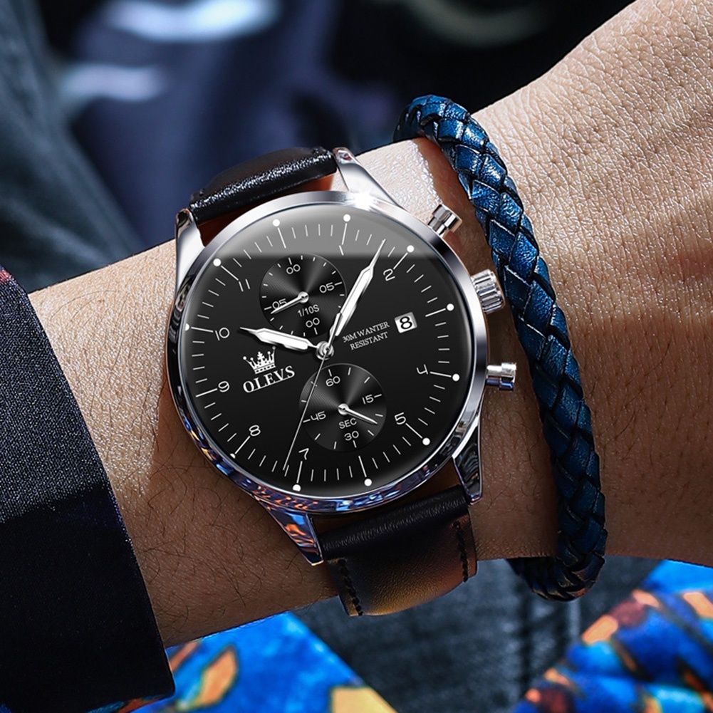 OLEVS Jam Tangan Pria Anti Air Original Kulit Tahan Keren Led Hitam Putih Terbaru Luxury Chronograph Watch Men Multifungsi
