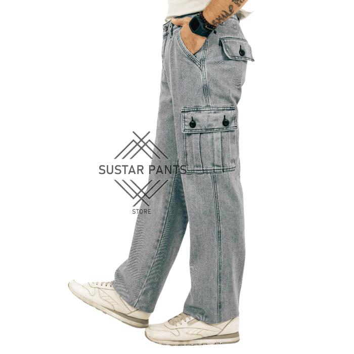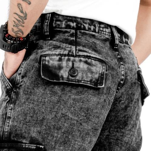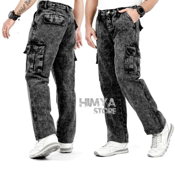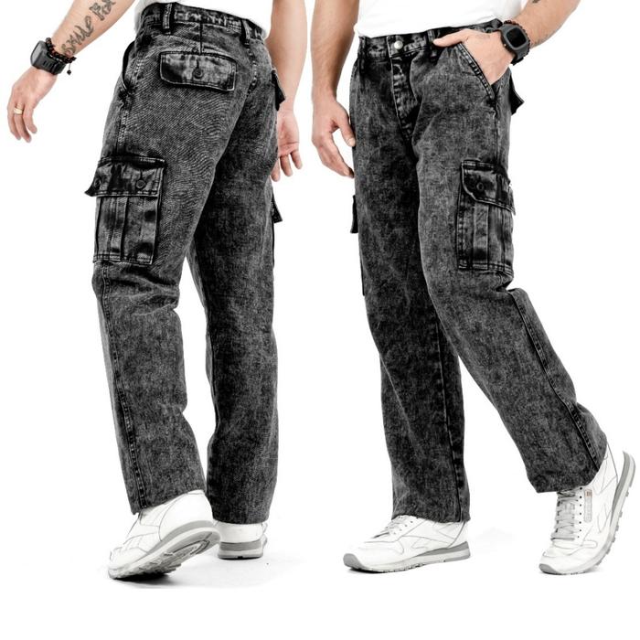 Celana Cargo Jeans Pria Loose Fit Reguler / Cargo Pants Jeans Reguler Standard Denim Black Wash - Black Sandwash, 28