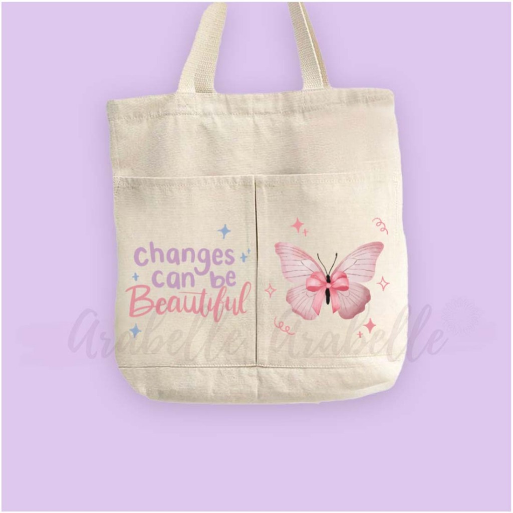 Totebag Kanvas Dua Kantong Bergambar Kupu Kupu Quotes/Totebag Kanvas/Totebag Sekolah/Totebag Jalan Jalan/Bisa