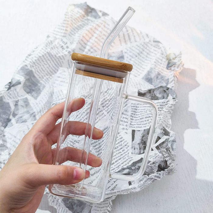 KAMJE Cangkir Kaca Kotak Aesthetic 350ml Tahan Panas dengan Sedotan & Tutup Elegan Kopi Teh Susu - Transparan
