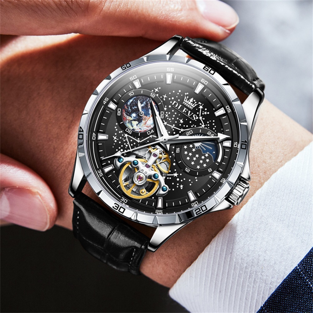 OLEVS Jam Tangan Automatic Pria Original Anti Air Kulit Tahan Keren Led Hitam Biru Putih Luxury Men Watch