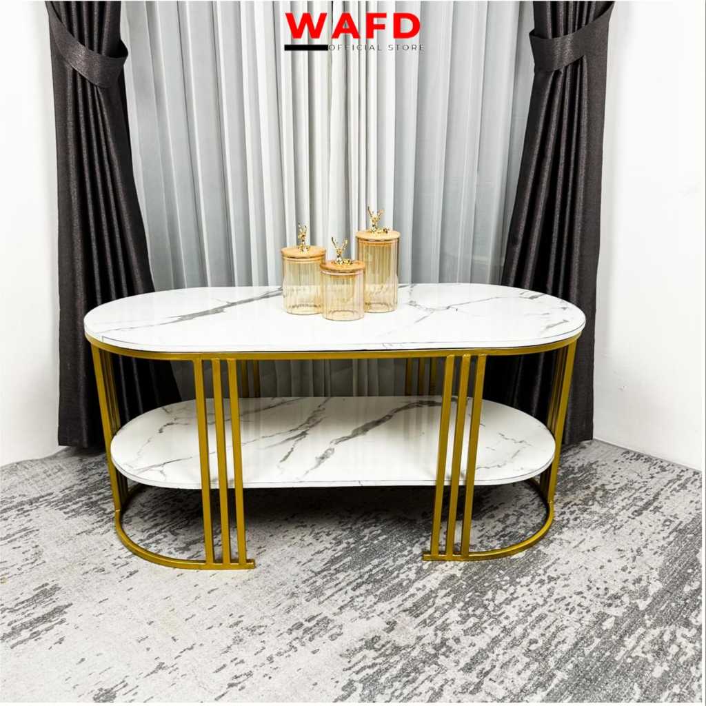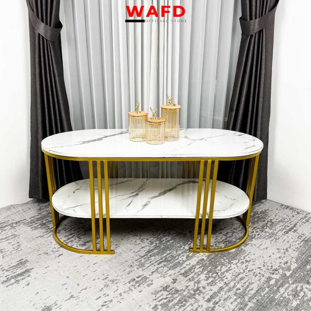 Meja Tamu minimalis Luna Oval 2 Tingkat Bahan Besi warna gold Replika Marmer Top HPL Gratis Ongkir