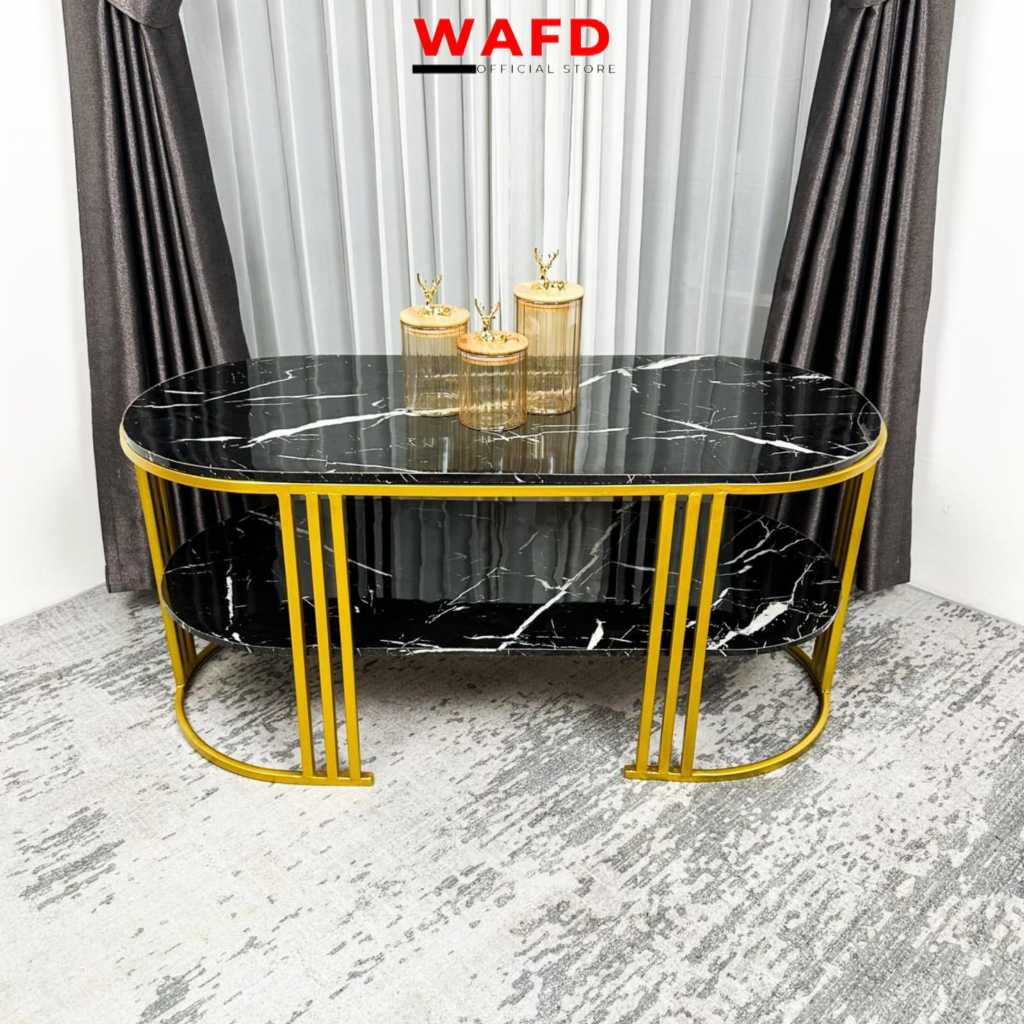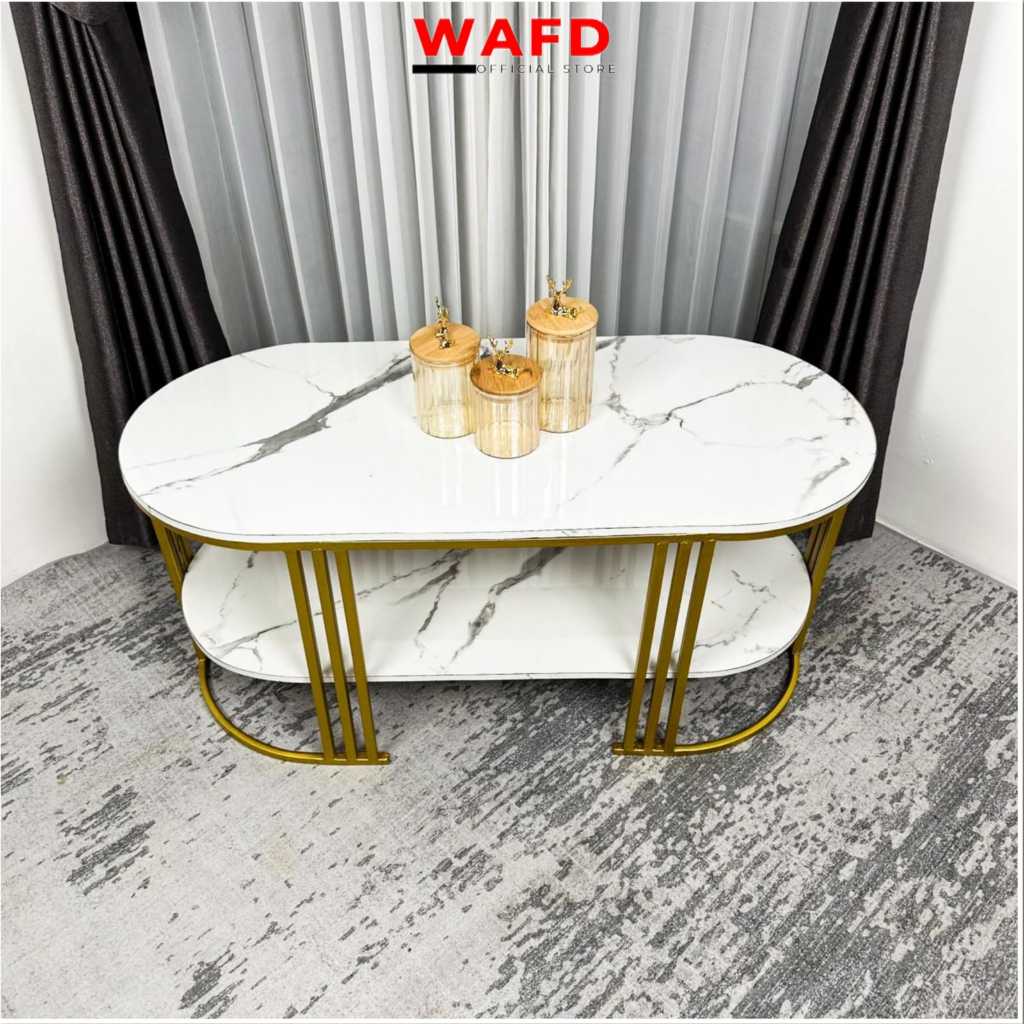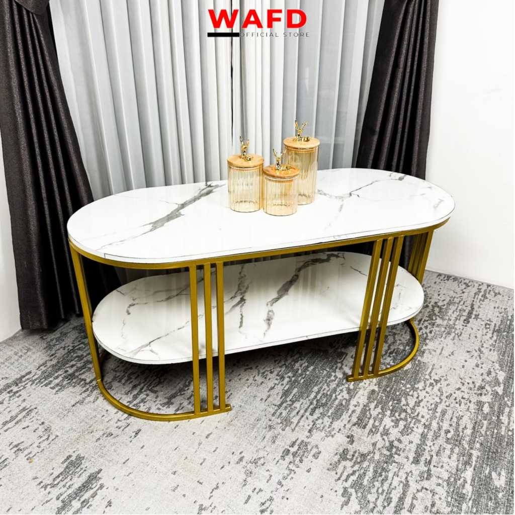 Meja Tamu minimalis Luna Oval 2 Tingkat Bahan Besi warna gold Replika Marmer Top HPL Gratis Ongkir
