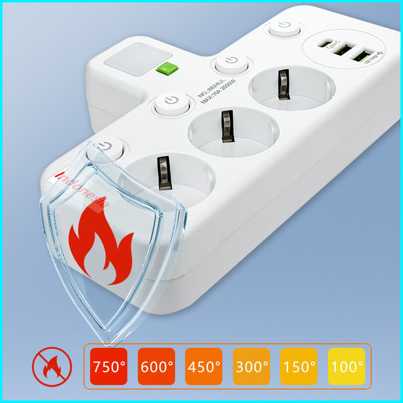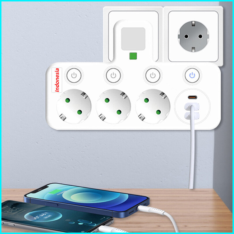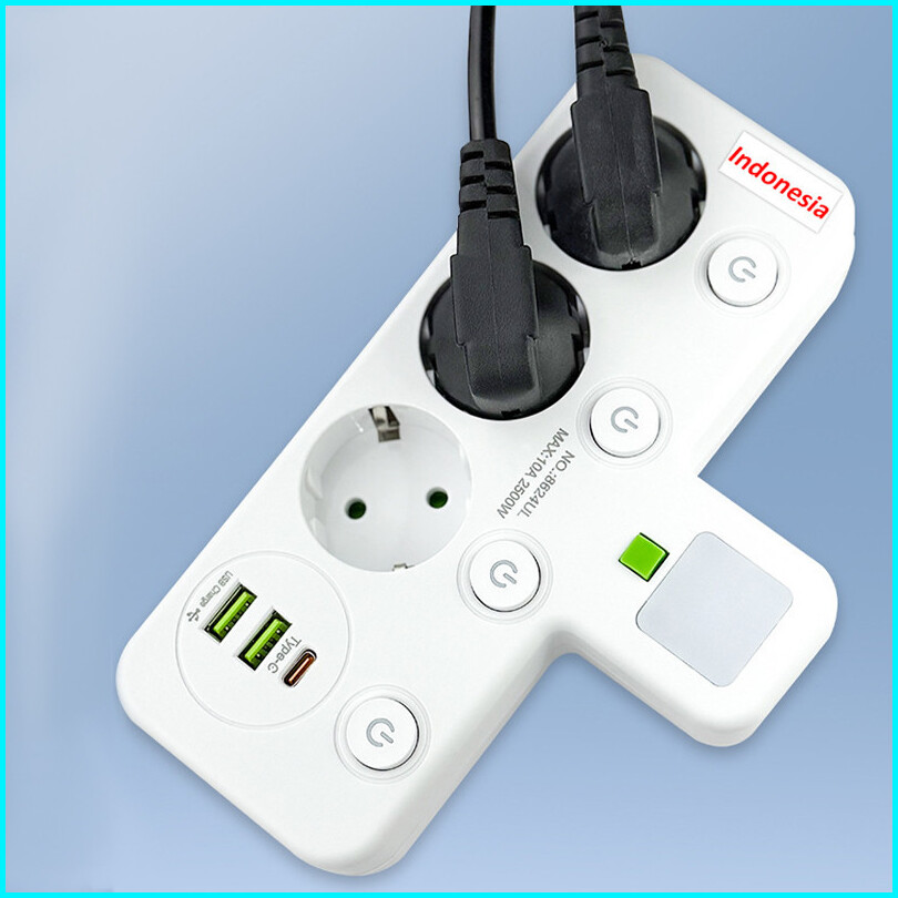 Stop Kontak Multiguna Lamp Led 5 Port Usb Type C - 2500w Tahan Api Steeker Eu Original