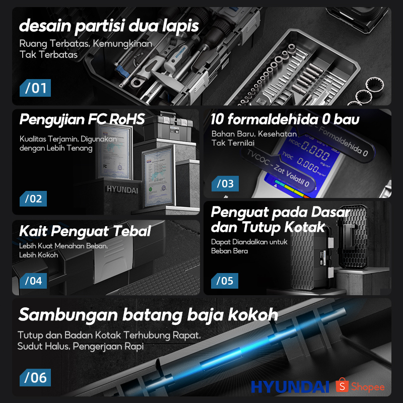 HYUNDAI Bor Listrik Set Lengkap Tool Box Alat Perkakas Baterai Cordless Tang Obeng Palu Kunci Pas Toolkit 55Set Pertukan