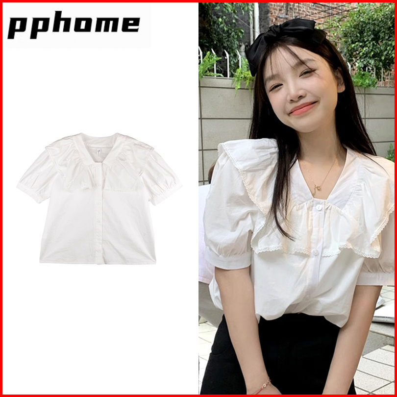 Kemeja Lengan Puff Berkerah V Berwarna Putih Baju Lengan Pendek
