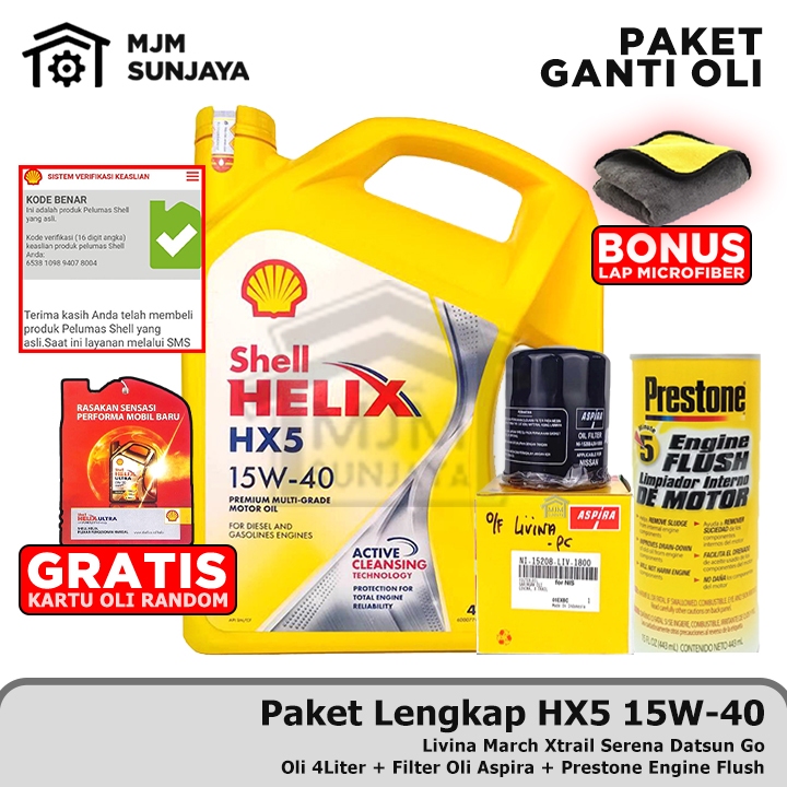 [Gratis Filter Oli] Paket Lengkap Ganti Oli Mesin Shell Helix Hx5 Sae 15W-40 4 Liter Engine Flush Aspira Nissan Grand Li