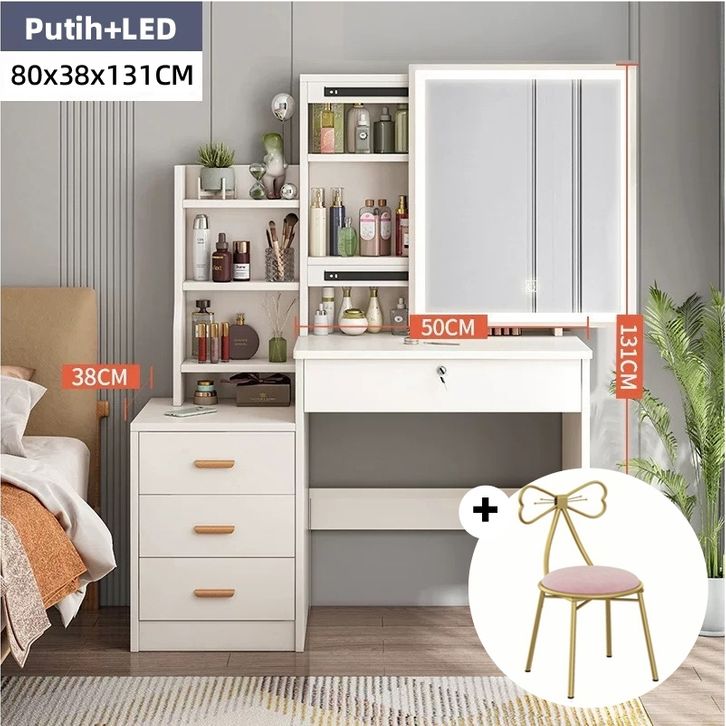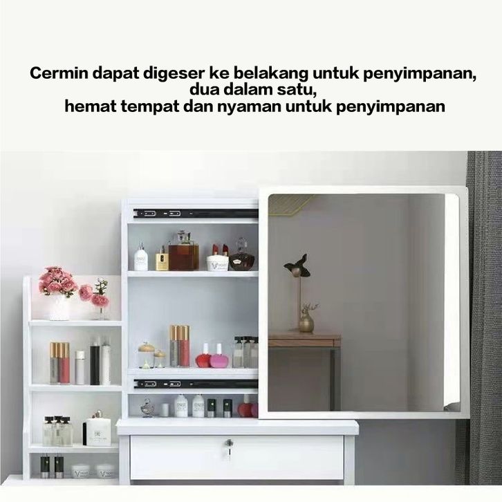 MEJA RIAS AESTHETIC LAMPU LED CERMIN KACA SLIDING MINIMALIS SET KURSI PITA RAK PENYIMPANAN KOSMETIK MAKEUP