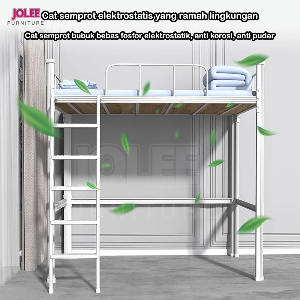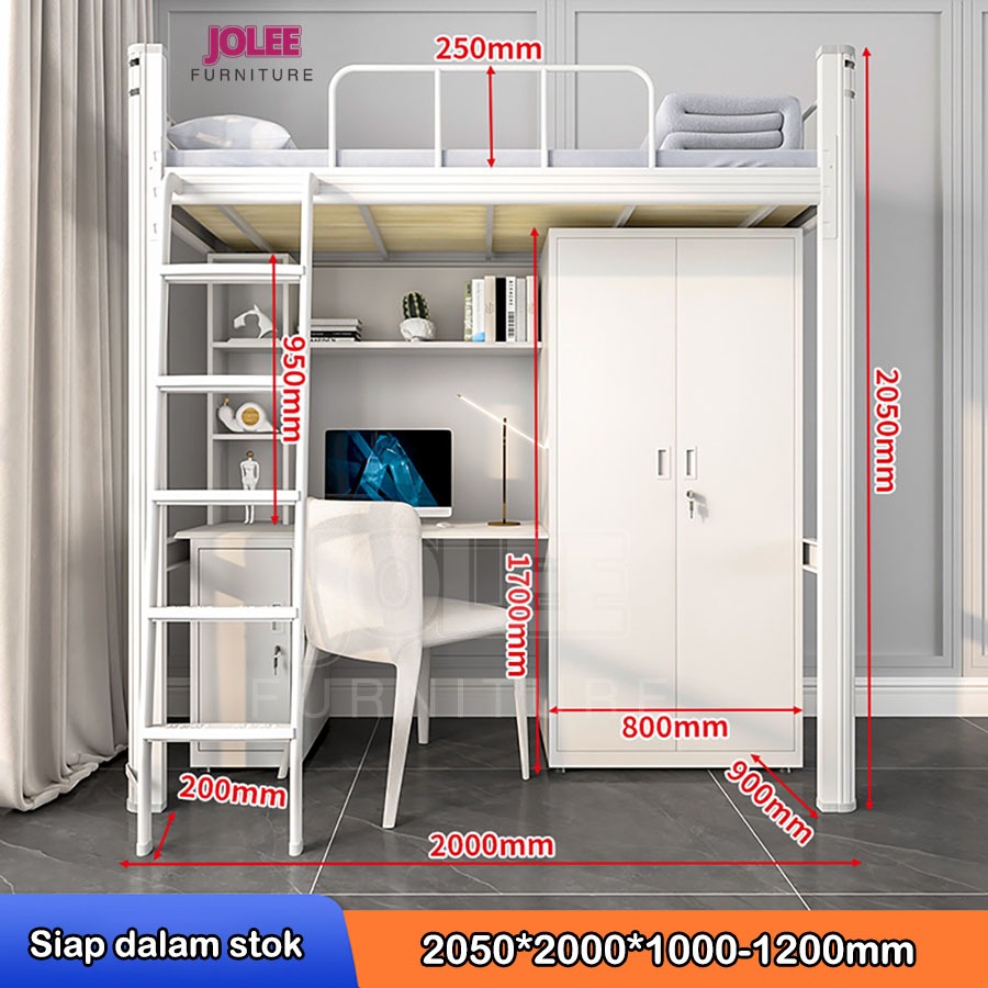 Tempat tidur susun besi, susun atas sebagai tempat tidur, susun bawah sebagai lemari+rak buku+meja