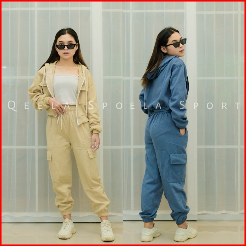 Qeelaofficial - One Set Bundle Pack Crop Hoodie Zipper X Cargo Sweatpants Jogger Korean Style