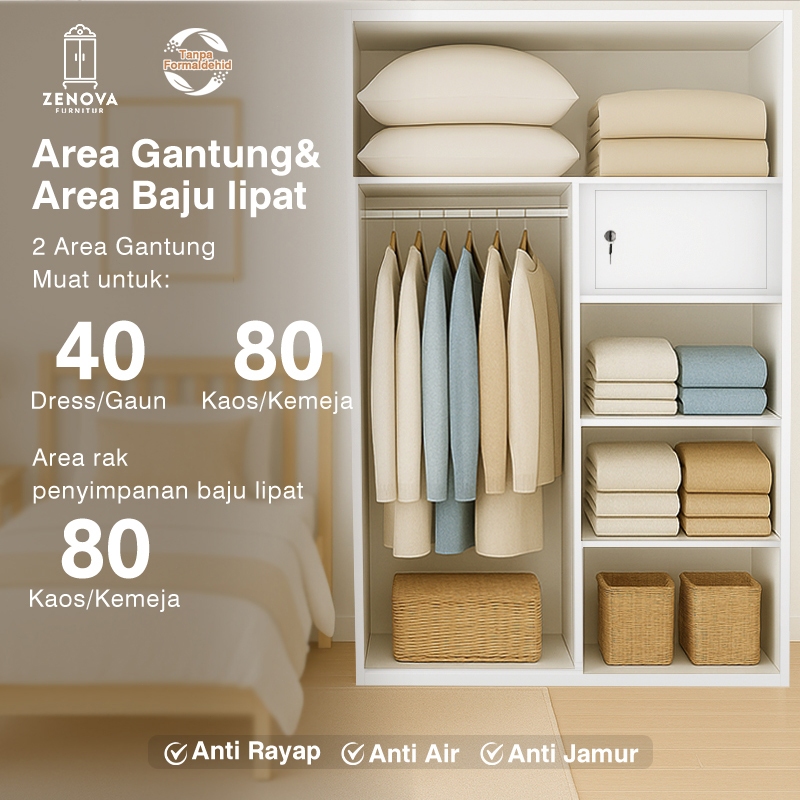 ZENOVA Official Lemari Pakaian Besi Lemari Pakaian 120cm 2 pintu slidding 2 Hanger Cermin Minimalis