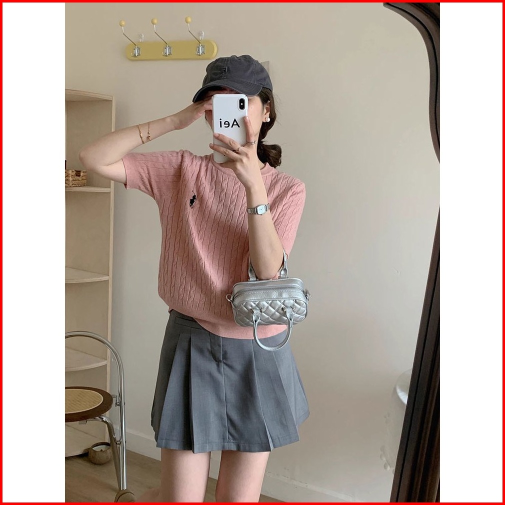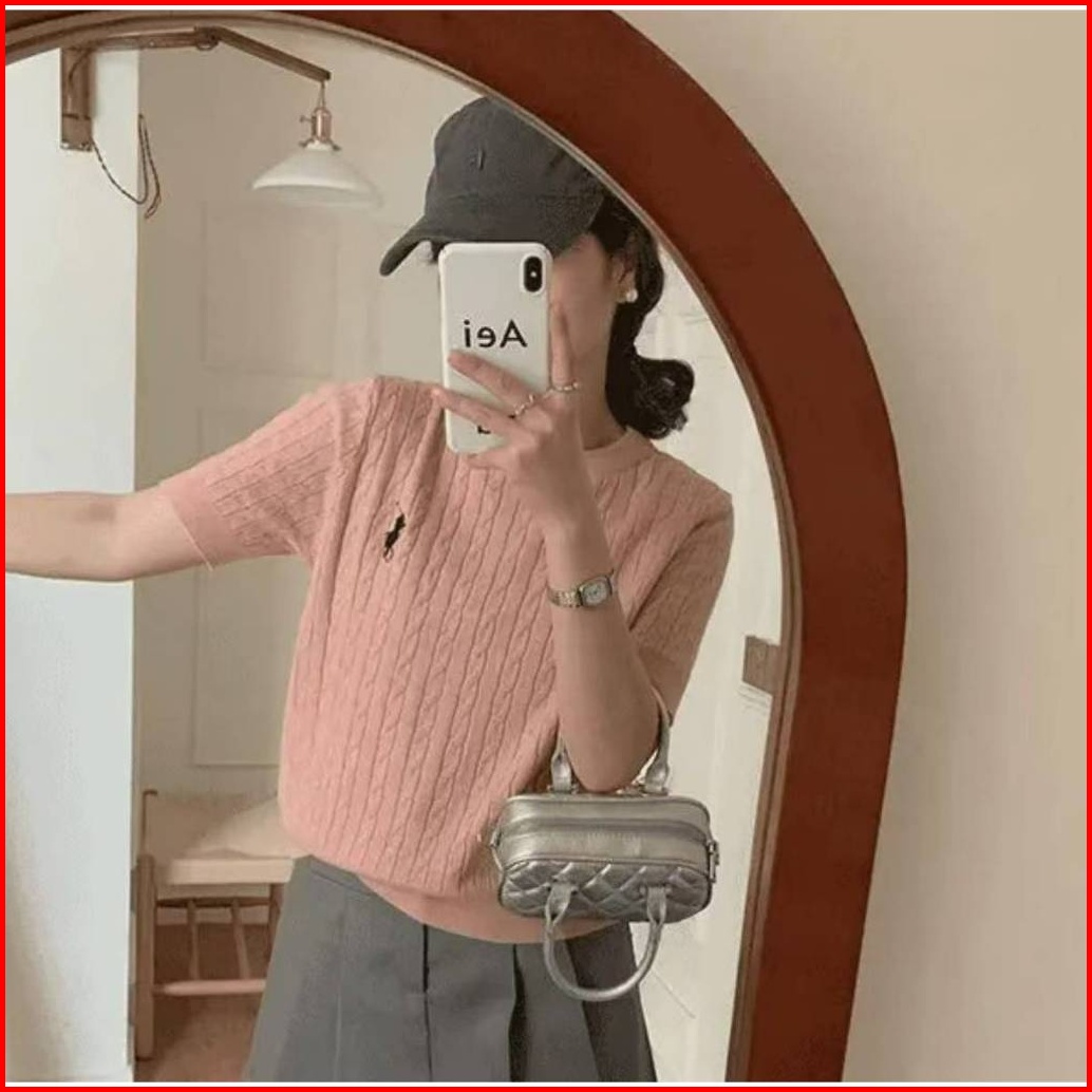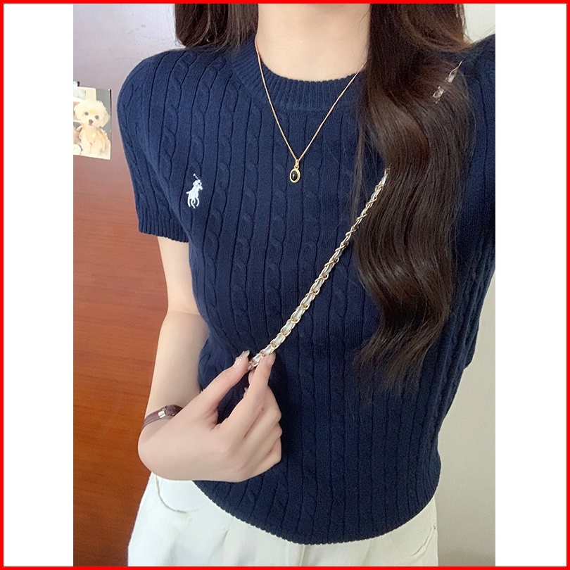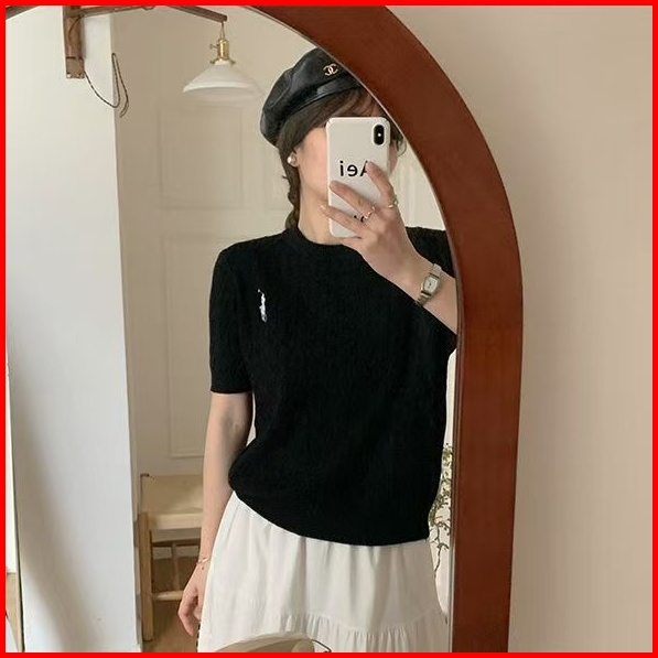 Shenning Polo Kaos Wanita Polos Kerah O Neck Rajut Singkat Pakaian Atasan Kemeja Knit Yang Langsing