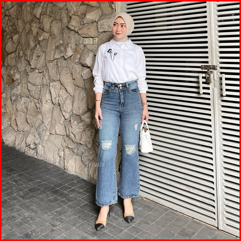 Trivela - Erica Cullotes Sobek Lapis Kulot Jeans Ripped Hijab Friendly 27-38 Jeans Wisker Wanita Highwaist Washed 27-34