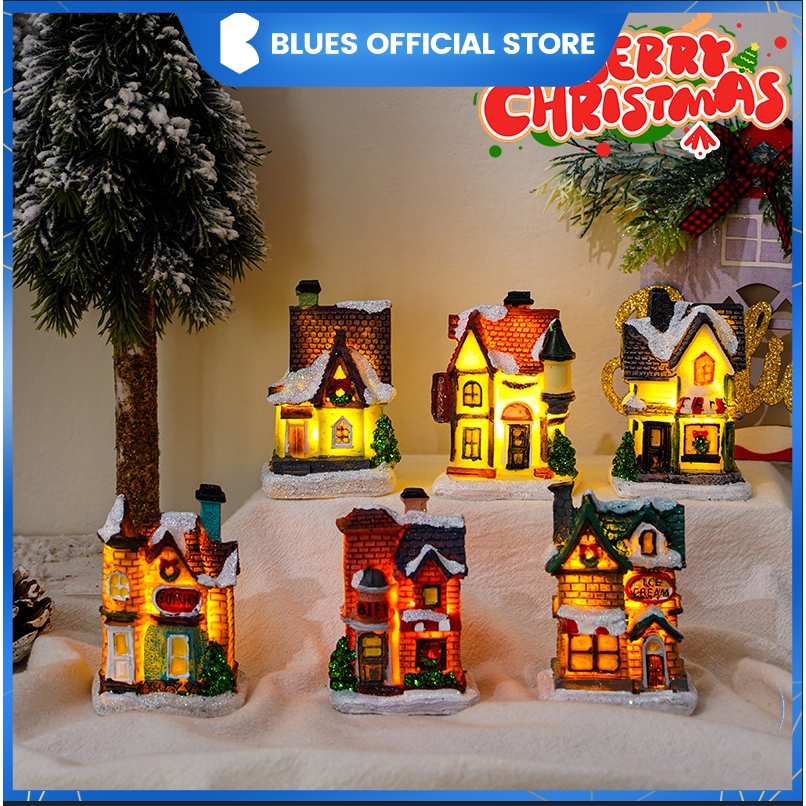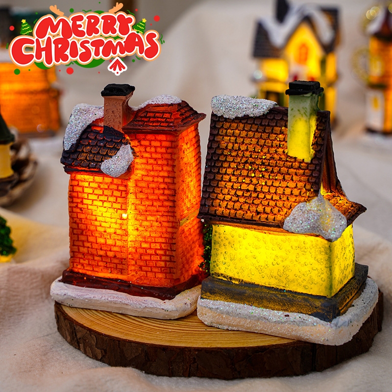Rumah Natal LED Snow House Resin Ornament Christmas Figurine Dekorasi Natal Xmas Miniature Craft