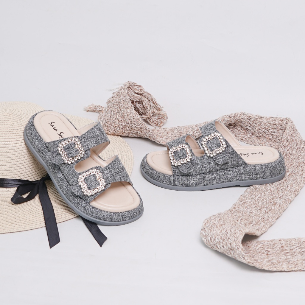 Sara sara Pretty sandal selop wanita platform bahan fabric tweed sendal slop cewek bahan kanvas